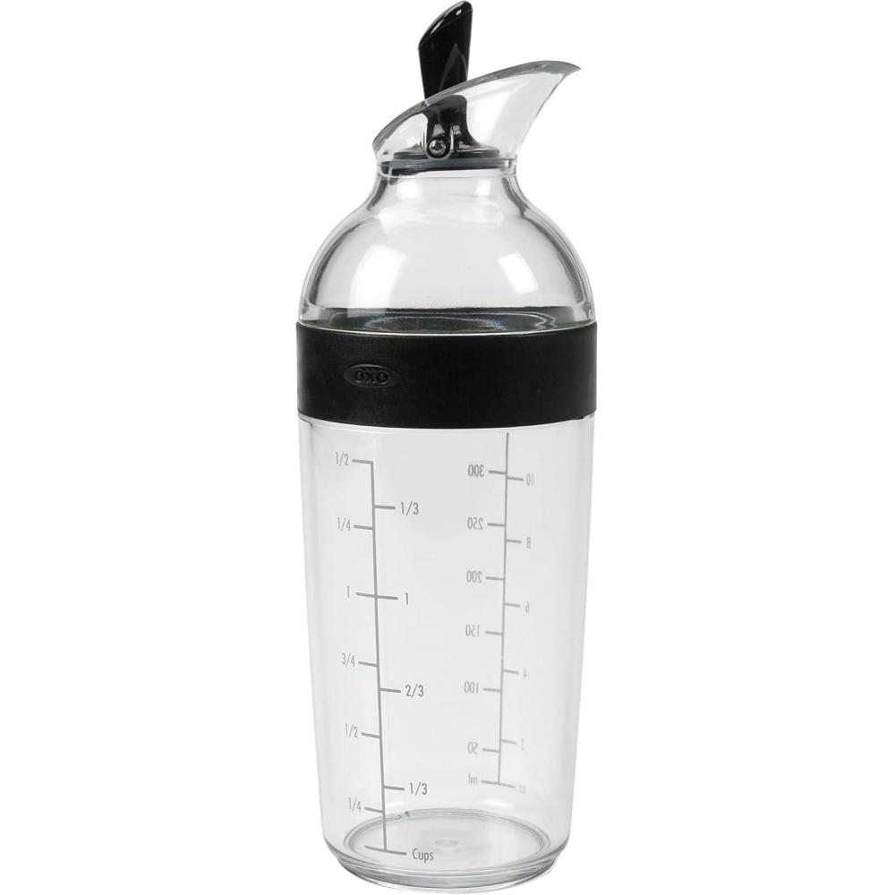 Mix, serve and store dressings, sauces, marinades and more with the OXO Good Grips Salad Dressing Shaker. The wide Shaker top unscrews for adding a range of ingredients like oil, vinegar, mayonnaise, mustard, garlic, onions and spices. Cup, milliliter and ounce markings are printed on the side for easy measuring. Once ingredients are added, simply screw the top closed and shake the watertight container to quickly mix. Flip the top lever back to pour and forward to seal. The 1.5-cup-capacity Shaker is dishwasher safe, highly durable and BPA free.
