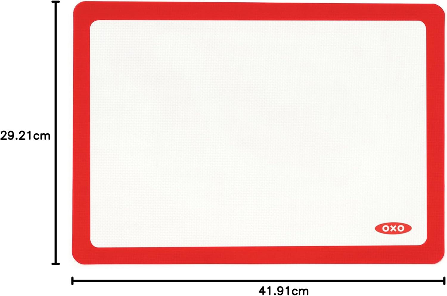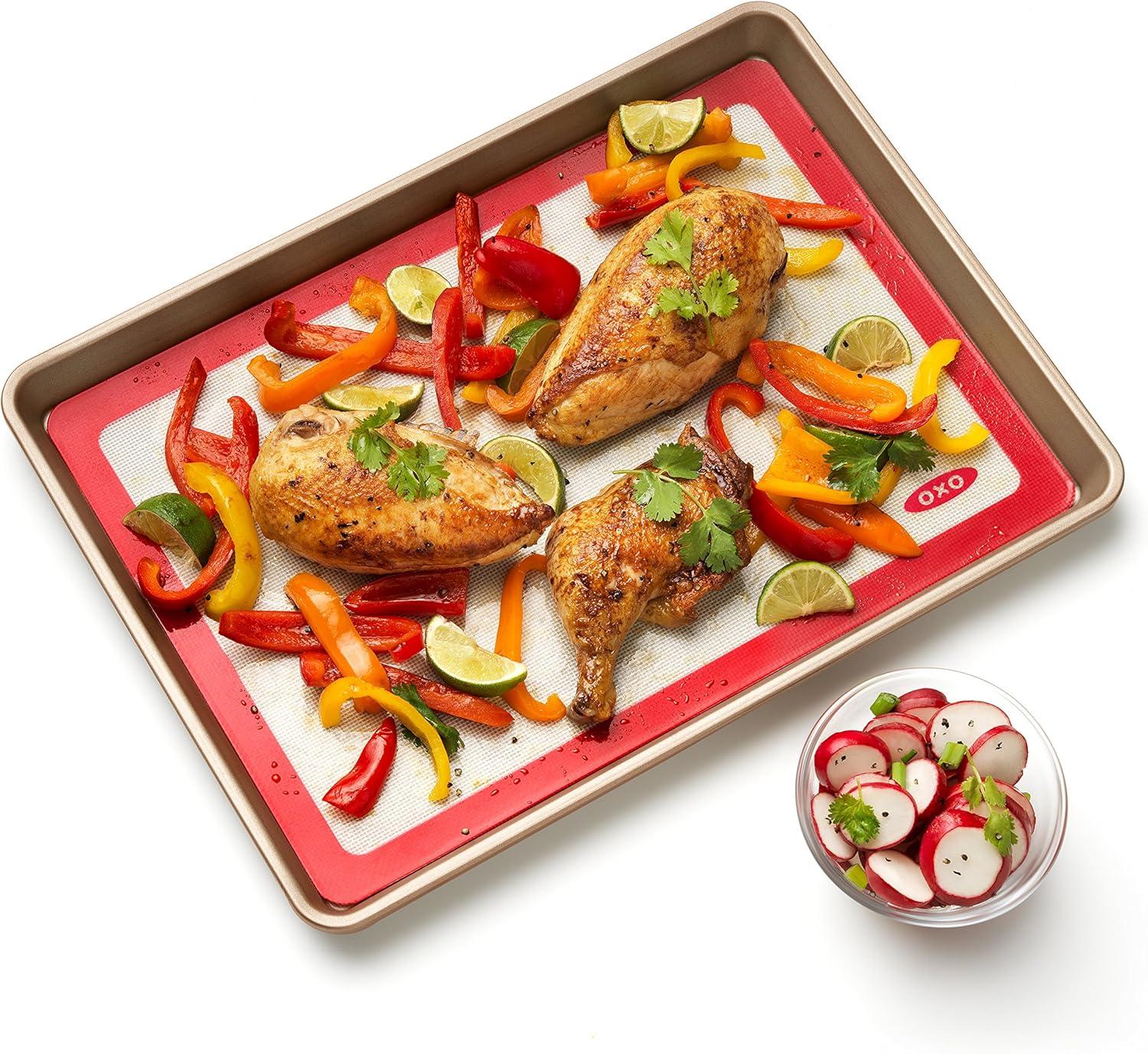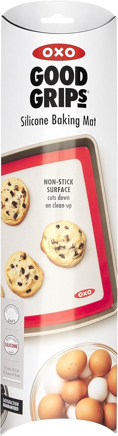 Whether you’re baking batches of chocolate chip cookies or roasting lemon chicken, you can transform it with the OXO Good Grips Silicone Baking Mat. This reusable, food-safe silicone Mat replaces parchment or waxed paper and easily withstands dough, grease and other cooking residue. Fiberglass and silicone construction provide structure and durability and the 11.5-in x 16.5-in dimensions make it perfect for half-sheet pans. Dishwasher safe.
