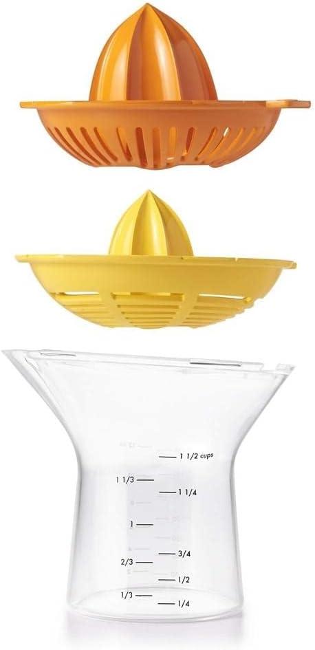 The OXO Good Grips Small Citrus Juicer is the ideal size for measuring citrus juice for cooking and baking. The Juicer is a 2. 5 ounce cup with convenient measuring markings and features a unique reamer design for easy and efficient juicing. The Reamer dish fits securely onto the cup for stability while juicing. The Juicer features a drip-free spout and disassemble for cleaning.