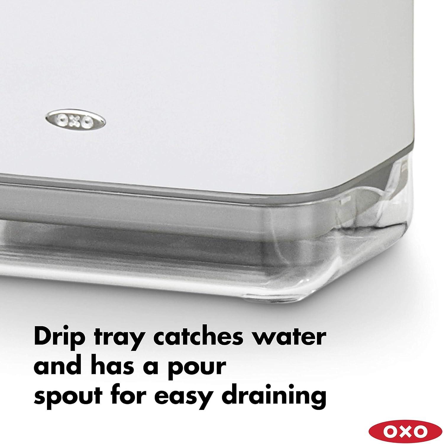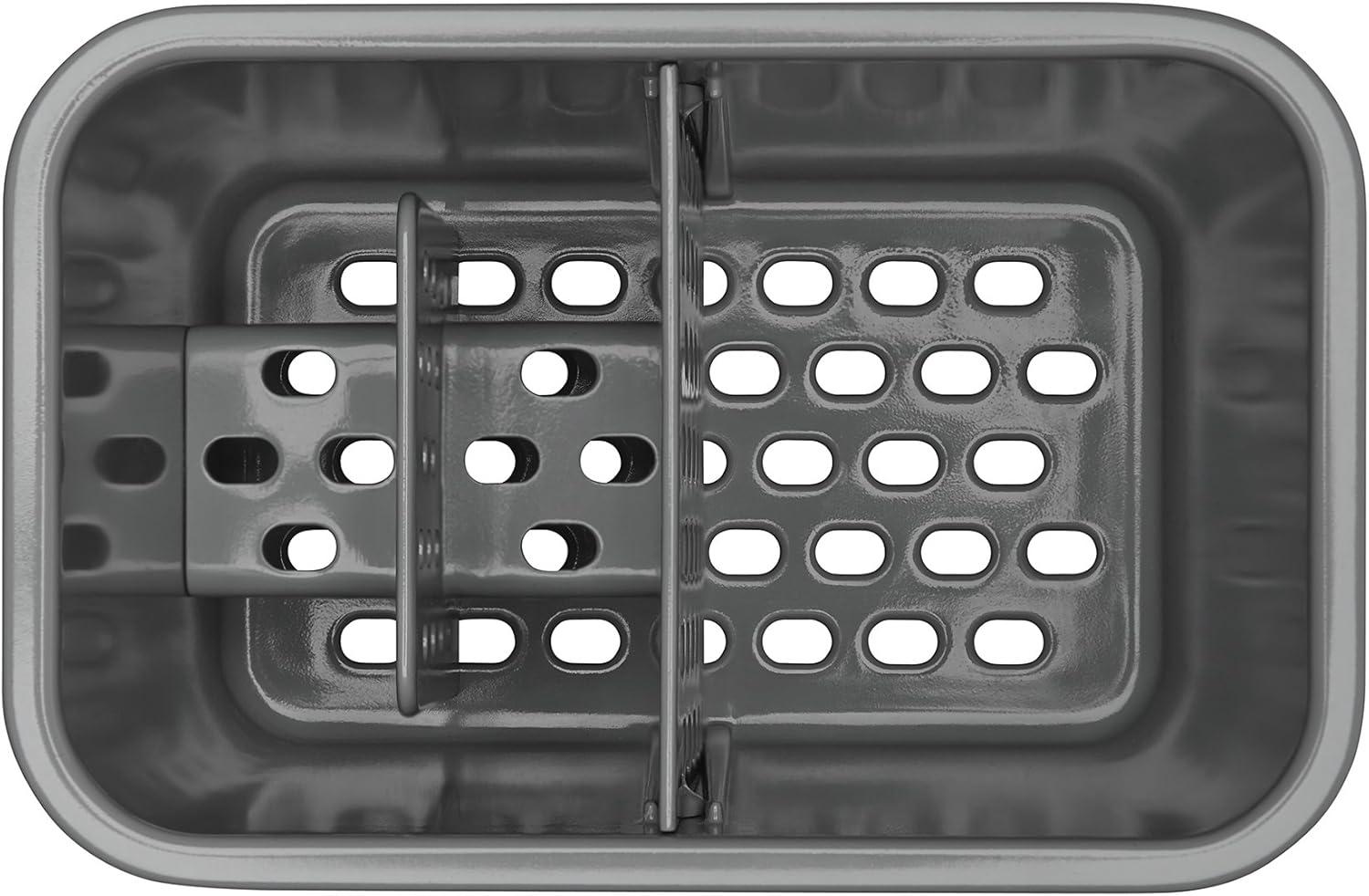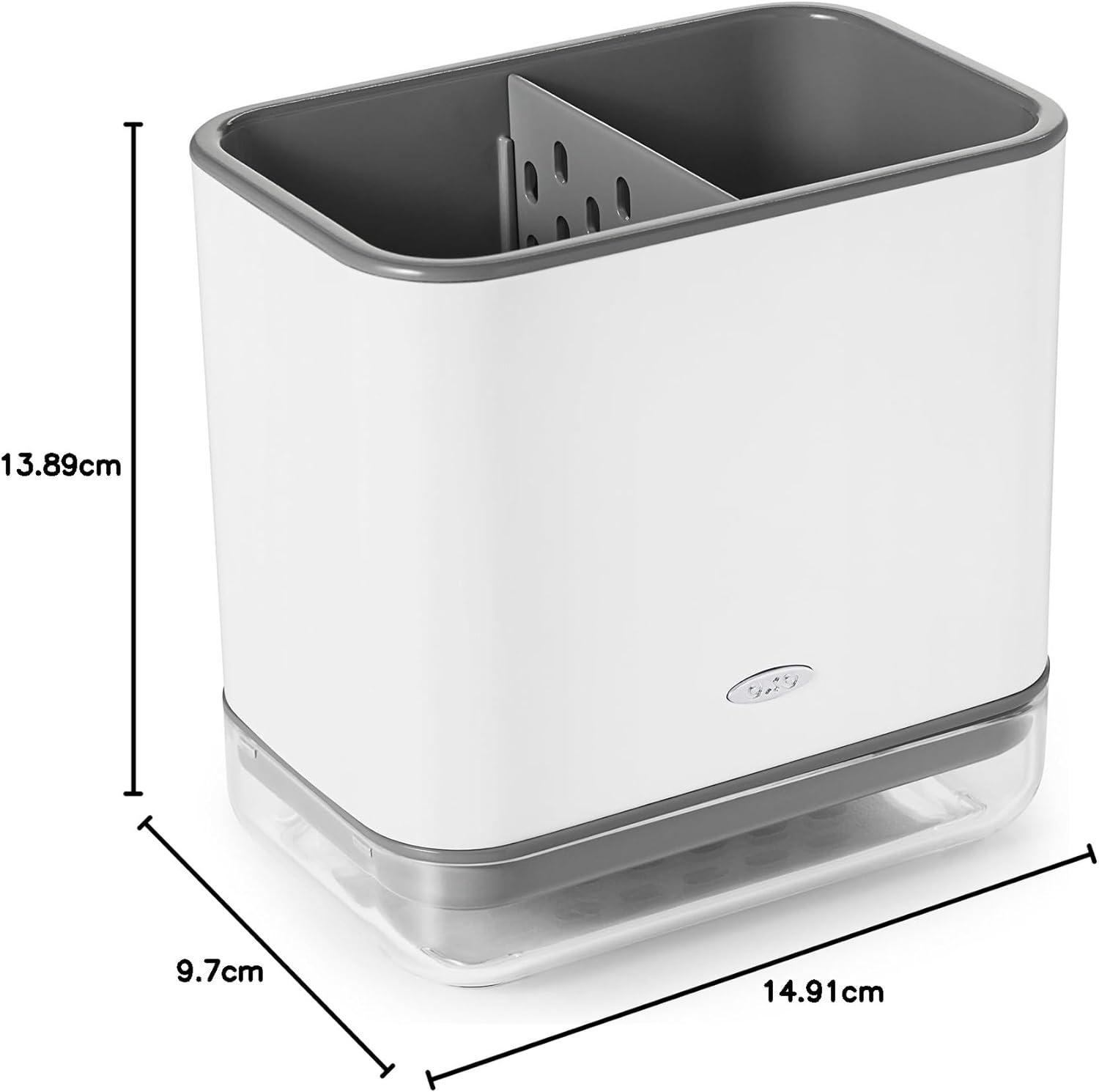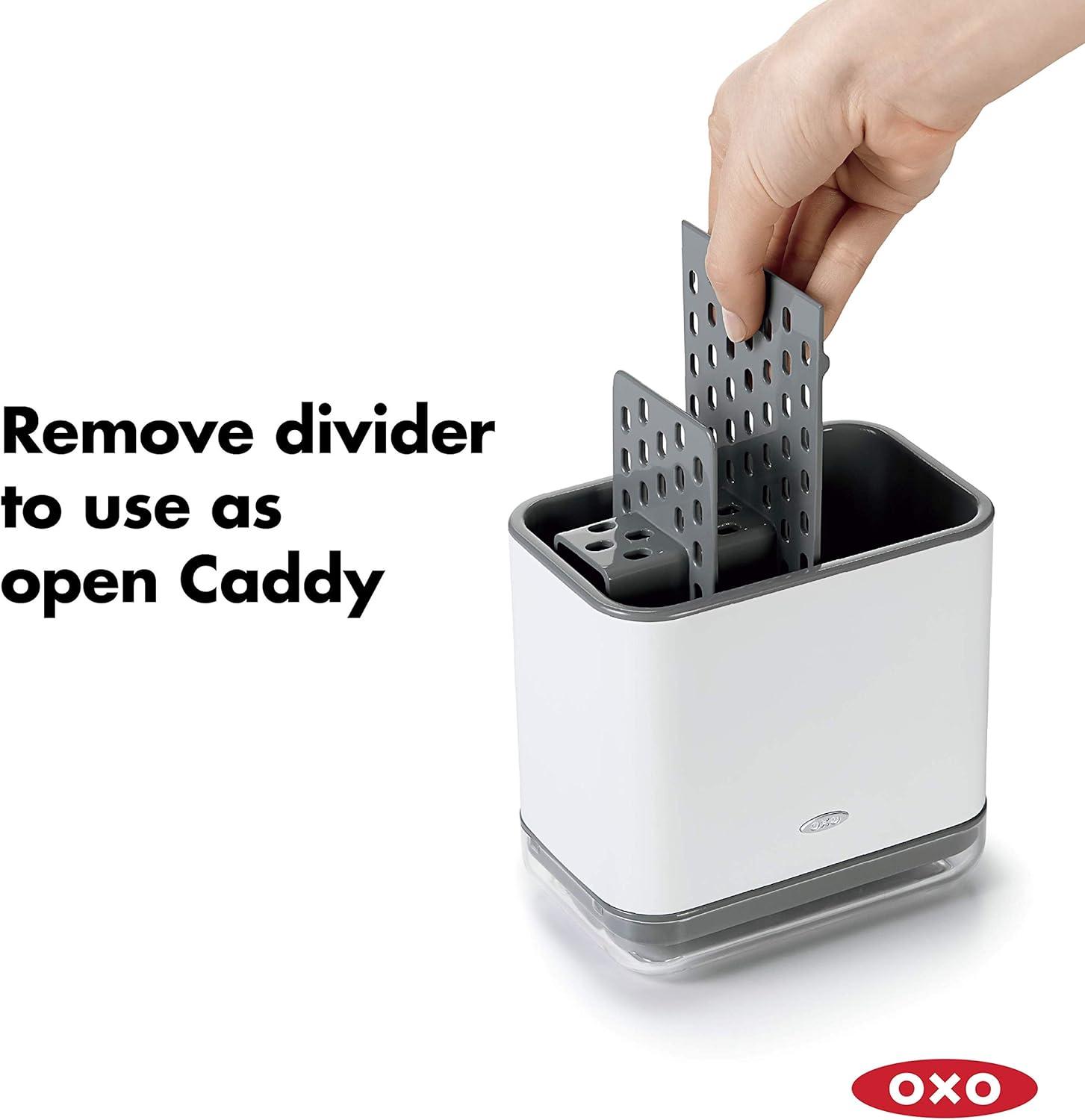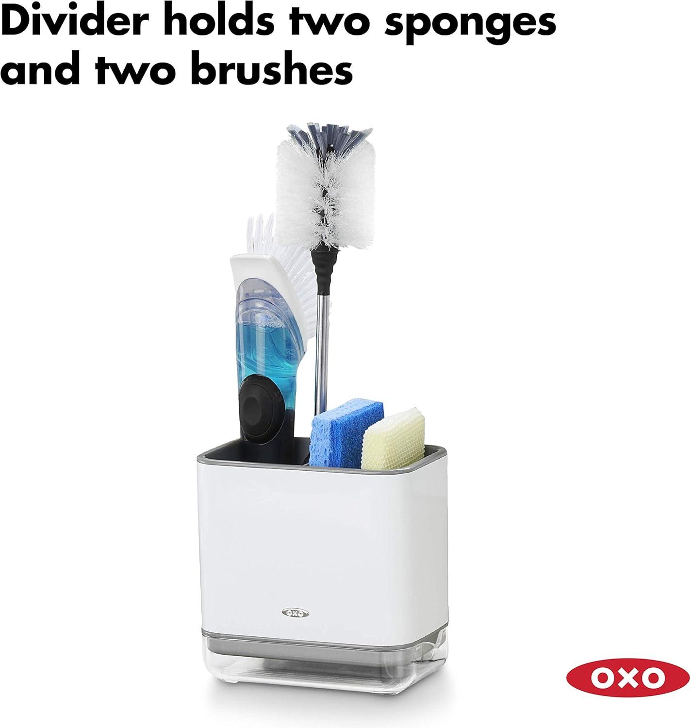 Keep your countertop organized and your cleaning tools close at hand with the OXO good grips stainless steel sink ware caddy. The caddy's divider keeps cleaning tools apart and features ventilation holes for quick drying. Use the divider to hold two sponges and brushes, or remove the divider to use as an open caddy. A drip tray catches water and features a pour spout for easy draining. The sink ware caddy's stainless steel durable construction will keep your sponges and dish brushes organized while complementing your kitchen decor! Hand wash only. Removable divider separates cleaning tools for quick drying.