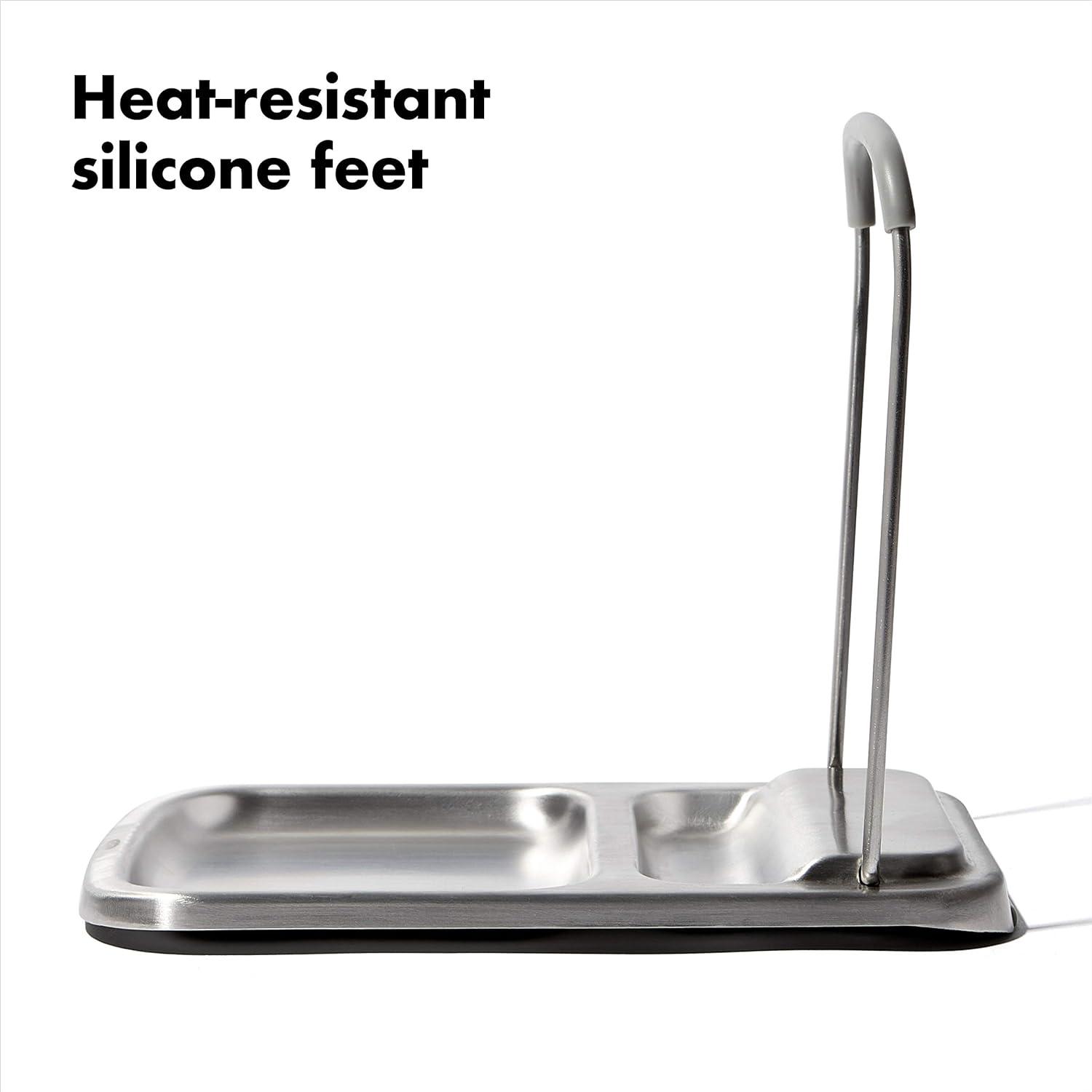 The OXO Good Grips Stainless Steel Spoon Rest with Lid Holder keeps countertops and stovetops tidy. The generously sized base holds multiple or oversized utensils and includes a built-in wire Lid Holder that keeps condensation and drippings off surfaces for easy cleanup. Heat-resistant silicone feet ensure the Spoon Rest stays cool to the touch on the stovetop and prevent scratches on countertops. Simply flip the Lid Holder up to hold large or small pot lids and flip it down for compact storage. Dishwasher safe.