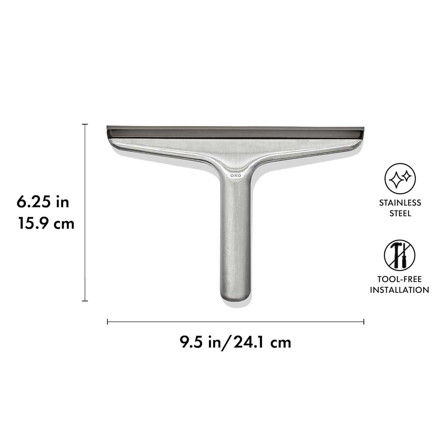 The OXO Good Grips Stainless Steel Squeegee quickly clears water from shower doors, walls, mirrors and tiled surfaces. The design of the strong, flexible blade was inspired by windshield wipers, and the blade easily adapts to contours for fast, streak-free drying. The soft, nonslip handle offers comfort and control when wet. This slim, lightweight tool made from durable stainless steel hangs conveniently from the included adhesive suction holder. This shower squeegee will complement your bathroom décor and is easy to access when you’re ready to clean. It’s perfect for all glass shower doors, bathroom walls, mirrors and tiled surfaces.