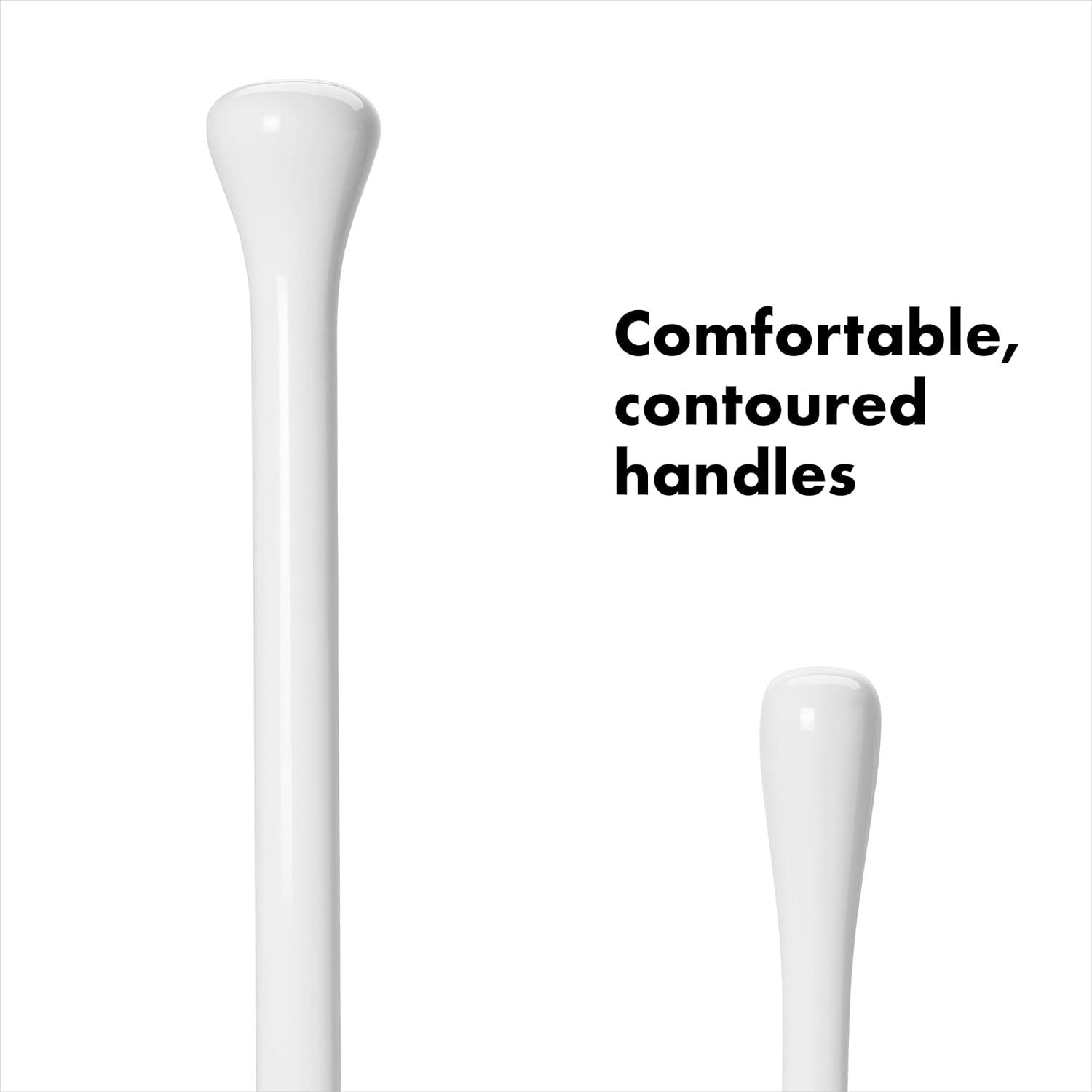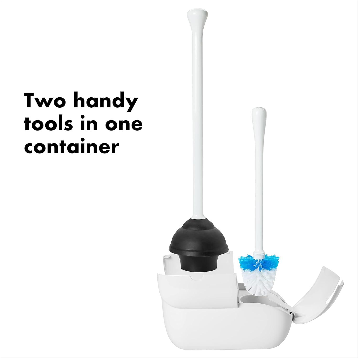 Store two bathroom essentials in one convenient spot with the OXO Good Grips Toilet Brush & Plunger Combo Set. The space-saving canister has a compact footprint, ideal for smaller spaces. Just lift the Brush or Plunger and the canister doors spring open—and stay open—until you’re ready to put it away. Comfortable, contoured handles provide a steady grip during use. Replacement brush heads available.