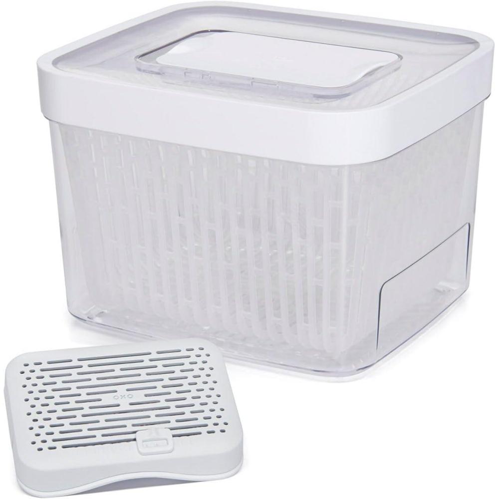 OXO Good Grips Greensaver™ Crisper Inserts prolong the lifespan of fruits and vegetables so that you can reduce food waste and enjoy the produce in your refrigerator before it spoils. Fruits and vegetables naturally emit ethylene gas, which speeds up the ripening process. GreenSaver Crisper Inserts absorb ethylene with non-toxic, enhanced Carbon Filters. Convenient suction cups make it easy to place Inserts and replace Filters. Pack includes 2 Crisper Inserts and 2 Carbon Filters. Each Filter should be replaced about every 90 days, when it will no longer have the capacity to absorb more ethylene.