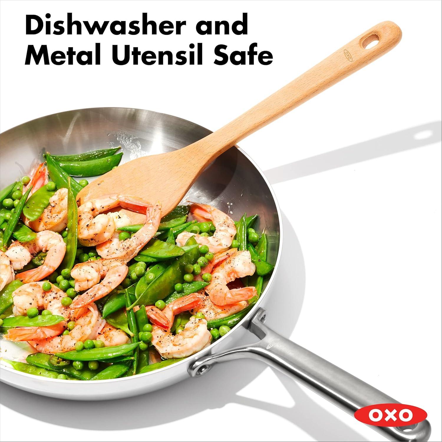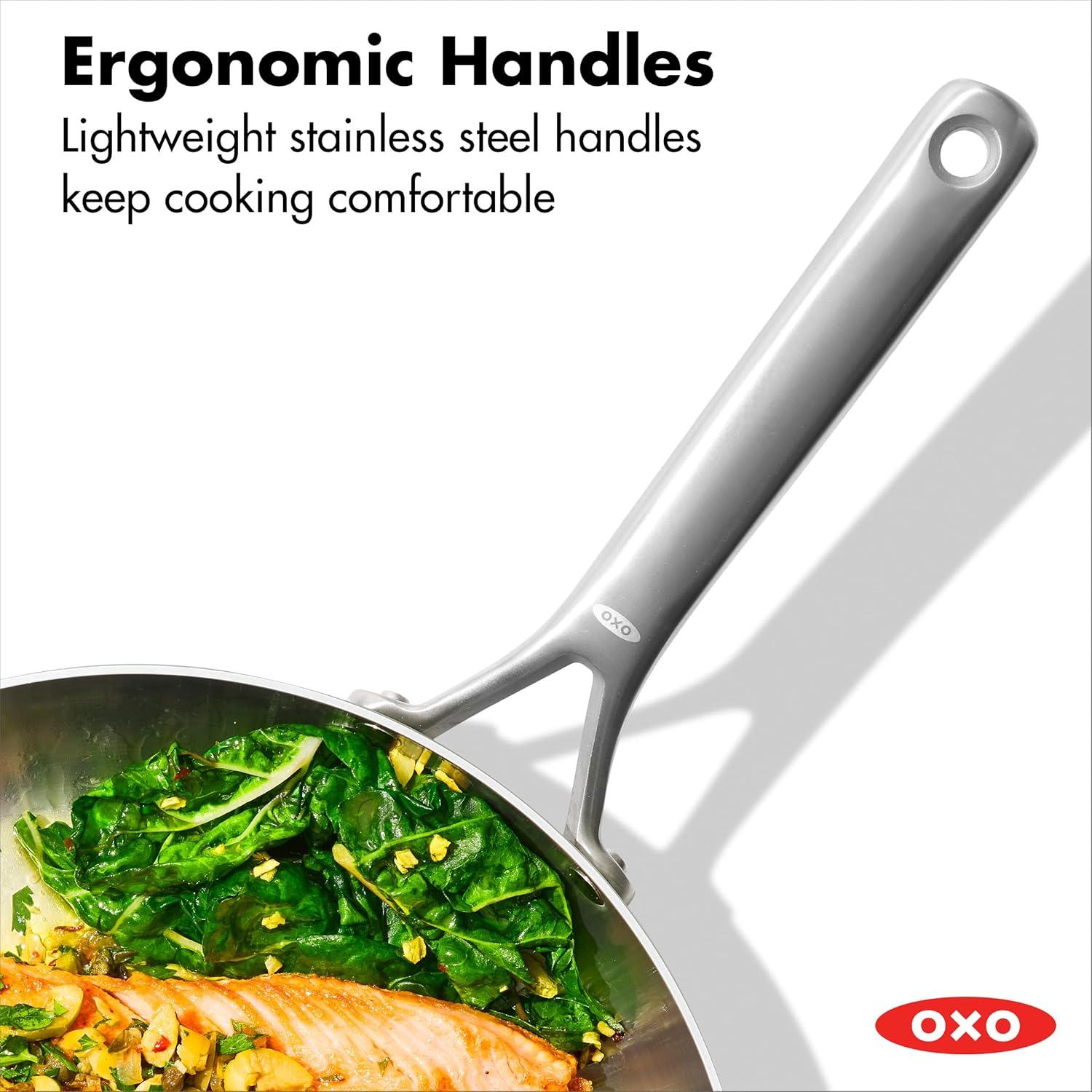 The OXO Mira 3-ply stainless steel collection is high-performance tri-ply built for modern kitchens. This 8” frying pan is a must for a classic breakfast, and perfect for sautéed veggies or smaller meals. The pan is crafted with two stainless steel layers and a heat-radiant aluminum core to deliver fast and even cooking. A stain-resistant finish on the exterior prevents heat discoloration. A lightweight, contoured stainless steel handle keeps cooking comfortable while the streamlined rivets eliminate food traps for a seamless, snag-free interior. The durable, all-metal construction is perfect for all stovetops, including induction, and can move directly from the stovetop to oven or the broiler. The tri-ply Mira collection is dishwasher safe for quick and easy cleanup. Oven safe up to 600˚F.