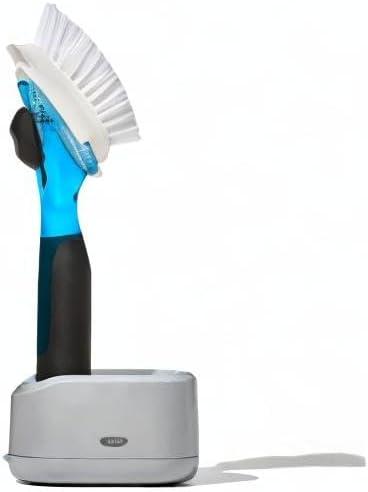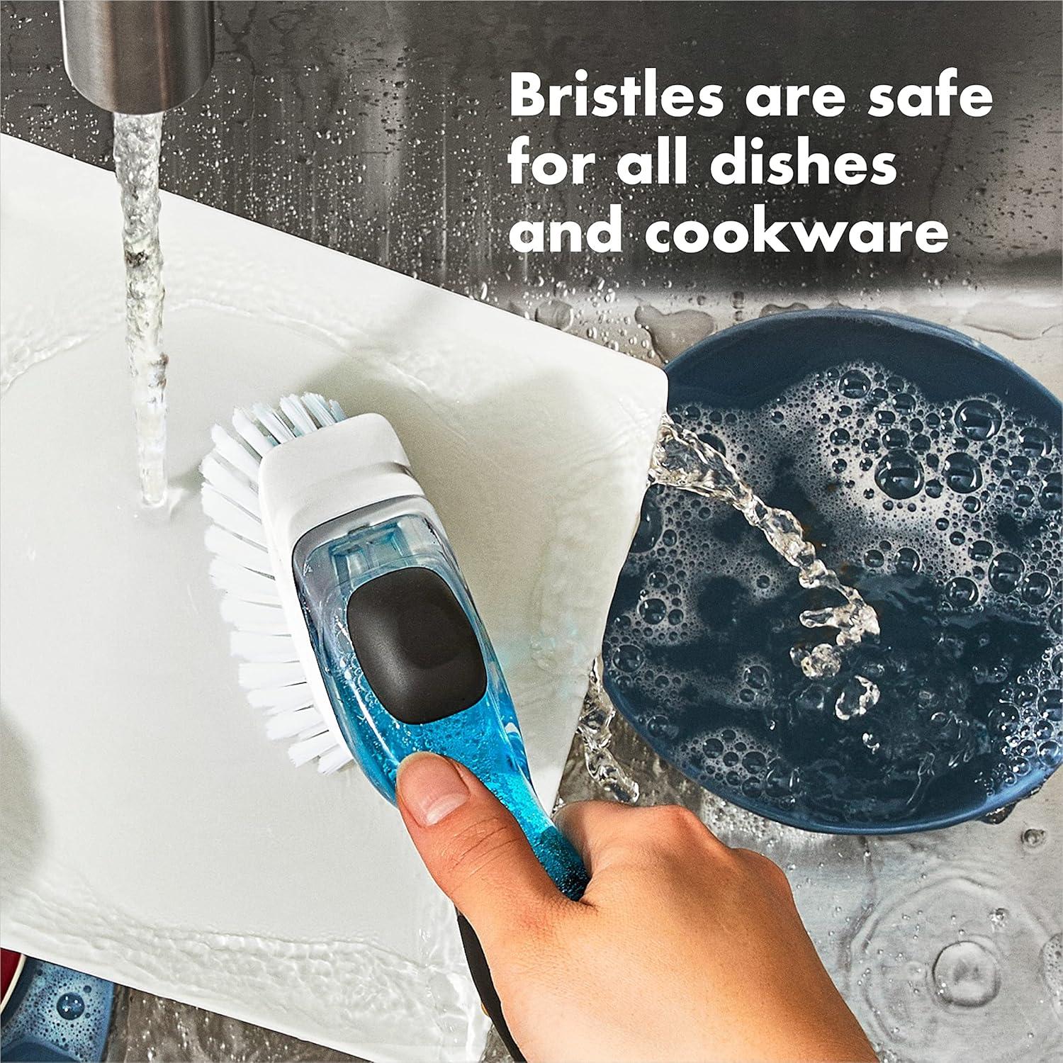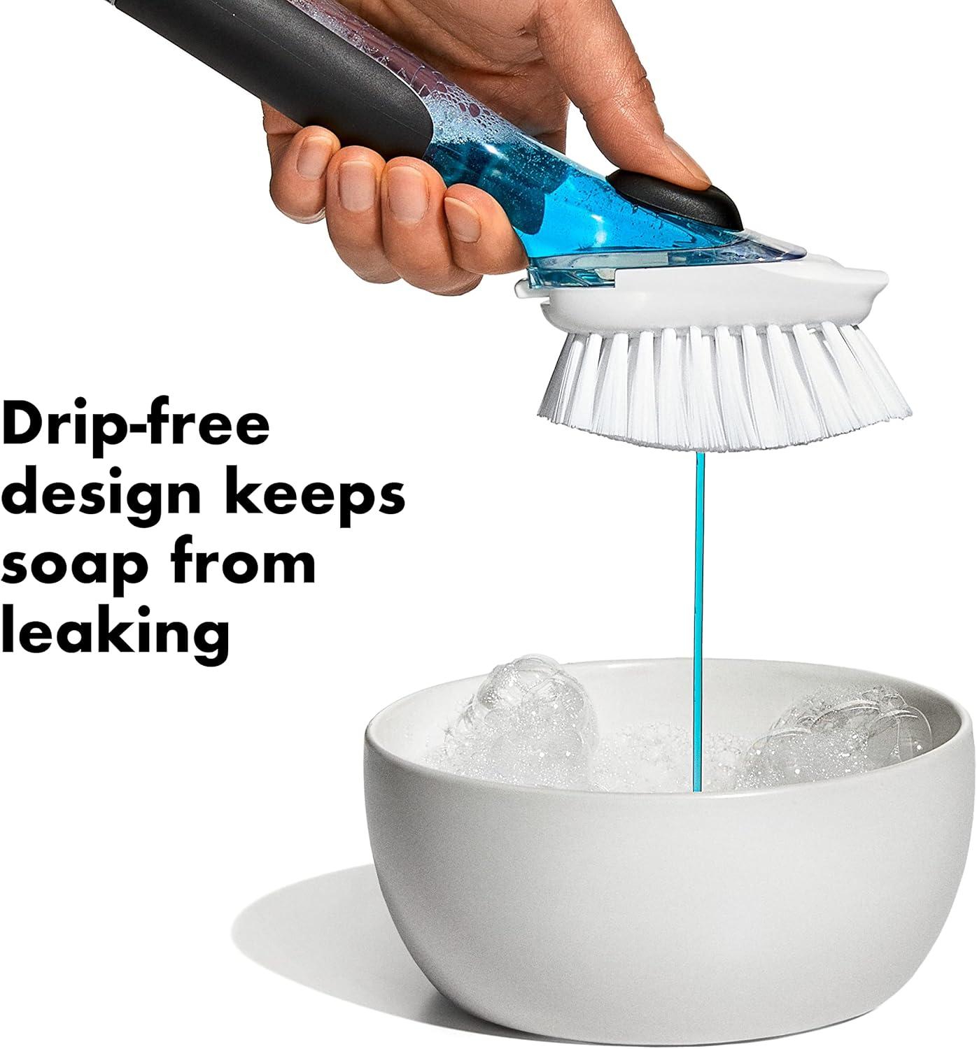 With a light push of the soft, non-slip button, the silicone valve shoots soap onto your dishes, then quickly seals to prevent drips and waste. Includes a scraper on back to remove baked-on food. Durable nylon bristles are safe for non-stick cookware and bakeware.