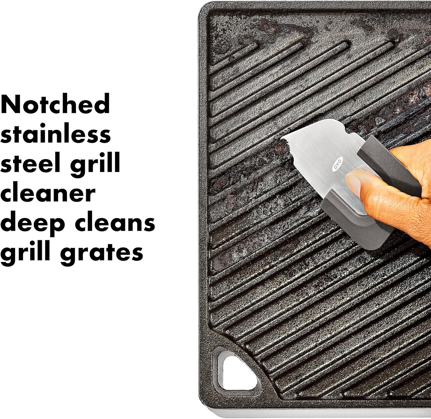 Stainless steel grill cleaner is notched to deep clean grill grates