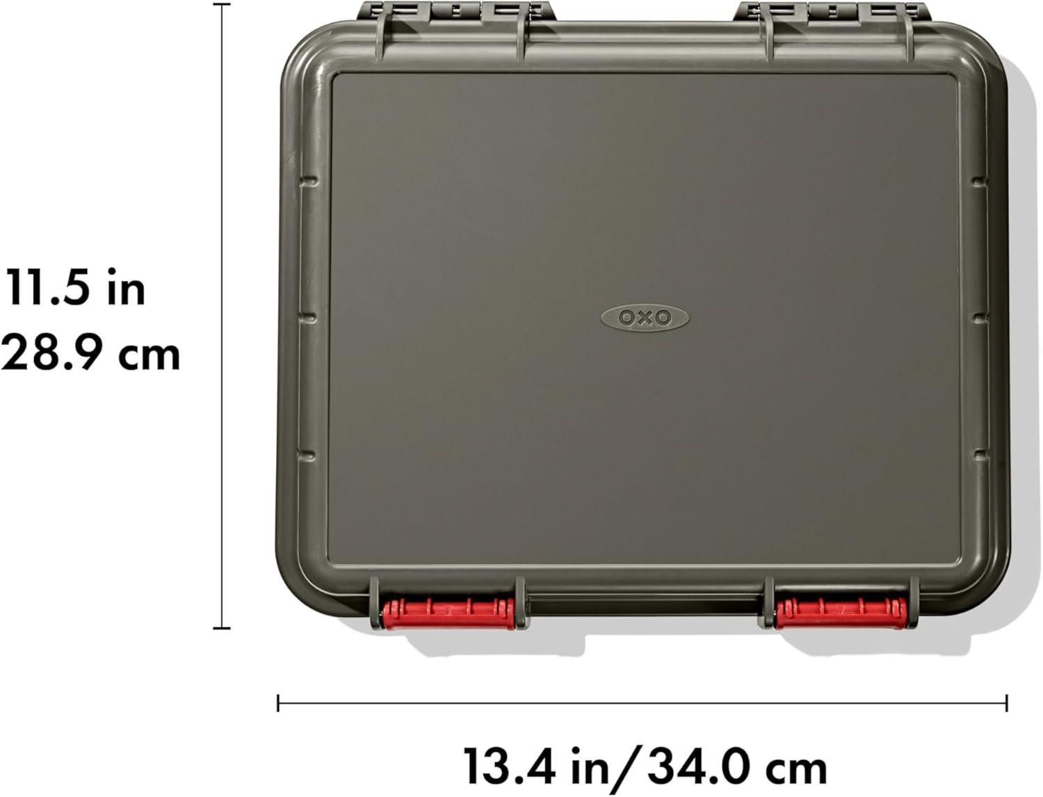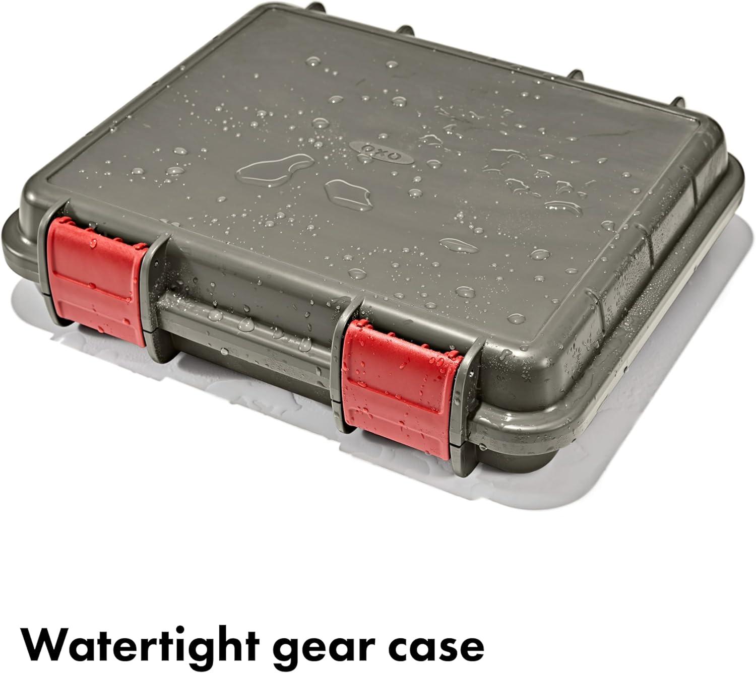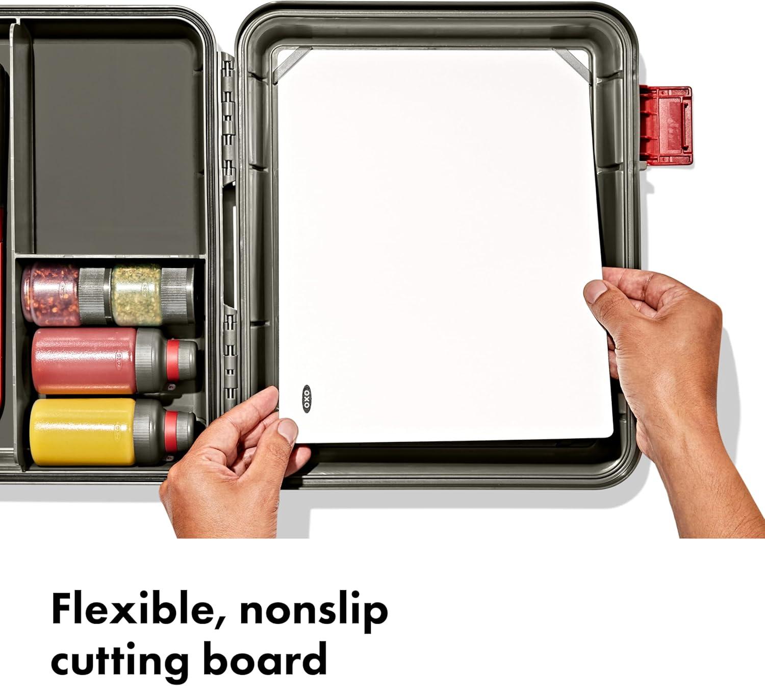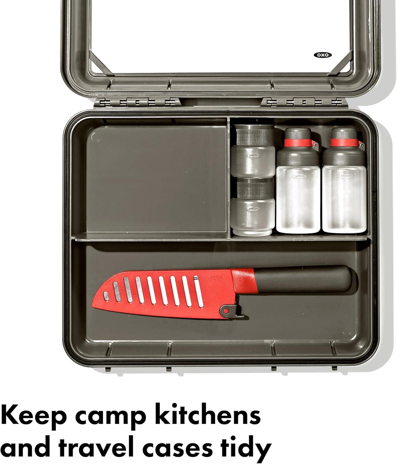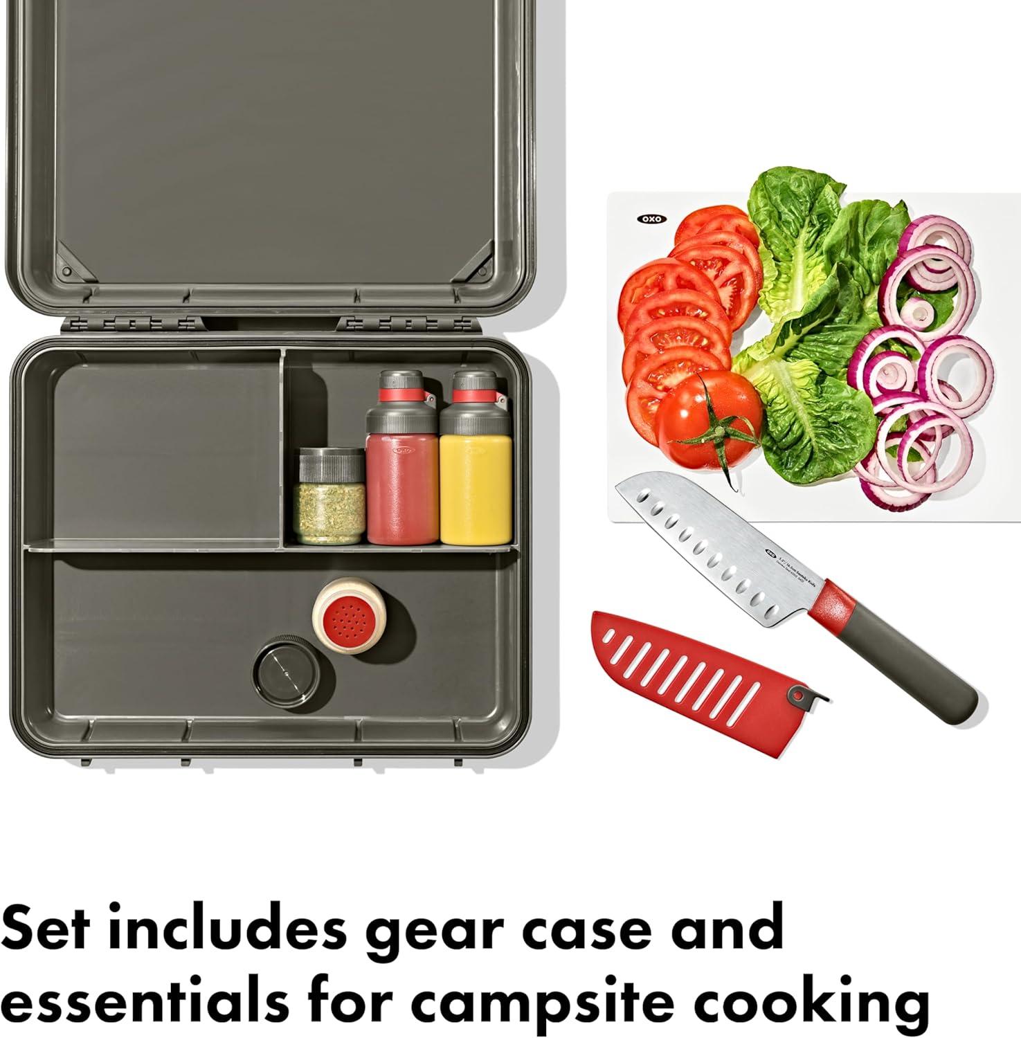 Tired of digging through your bins for your essential camp cooking tools? With the OXO Outdoor Camp Kitchen Prep Set, you can access your camp kitchen essentials in one efficient watertight gear case. This prep set comes with a watertight gear case, flexible cutting board, 5.5 in Santoku knife with sheath, two 3 oz leakproof squeeze bottles and two spice shakers. But wait, there’s room for more! There’s extra room in this case for other essentials like bottle openers, thermometers or measuring spoons. This gear case has an IPX5 waterproof rating – which means it’s resistant to splashes and sprays. The flexible cutting board fits in the lid of gear case, so it’s always right where you need it when you’re ready to prep your food. The 5.5 inch Santoku knife comes with a sheath that locks, so you can securely store it in between uses. The interchangeable spice shakers are very handy for bringing essential spices. They feature two shaker inserts – one with small holes for garlic powder, salt and cumin and one with large holes for red pepper flakes, oregano or dried onion. The leakproof squeeze bottles have interchangeable leakproof lids to safely transport and store bottles with condiments to and from home and the campsite. Set includes: Watertight gear case, flexible cutting board, 5.5 in Santoku knife with sheath, two 3 oz leakproof squeeze bottles, two spice shakers. OXO Outdoor – better tools to make better food in the outdoors.