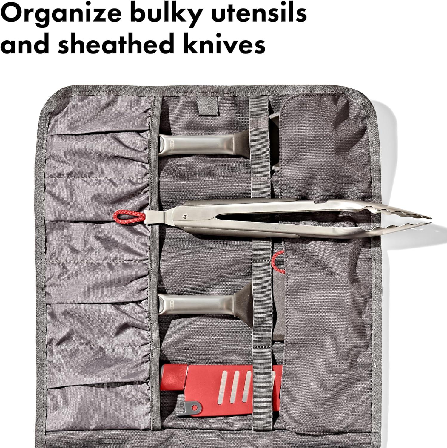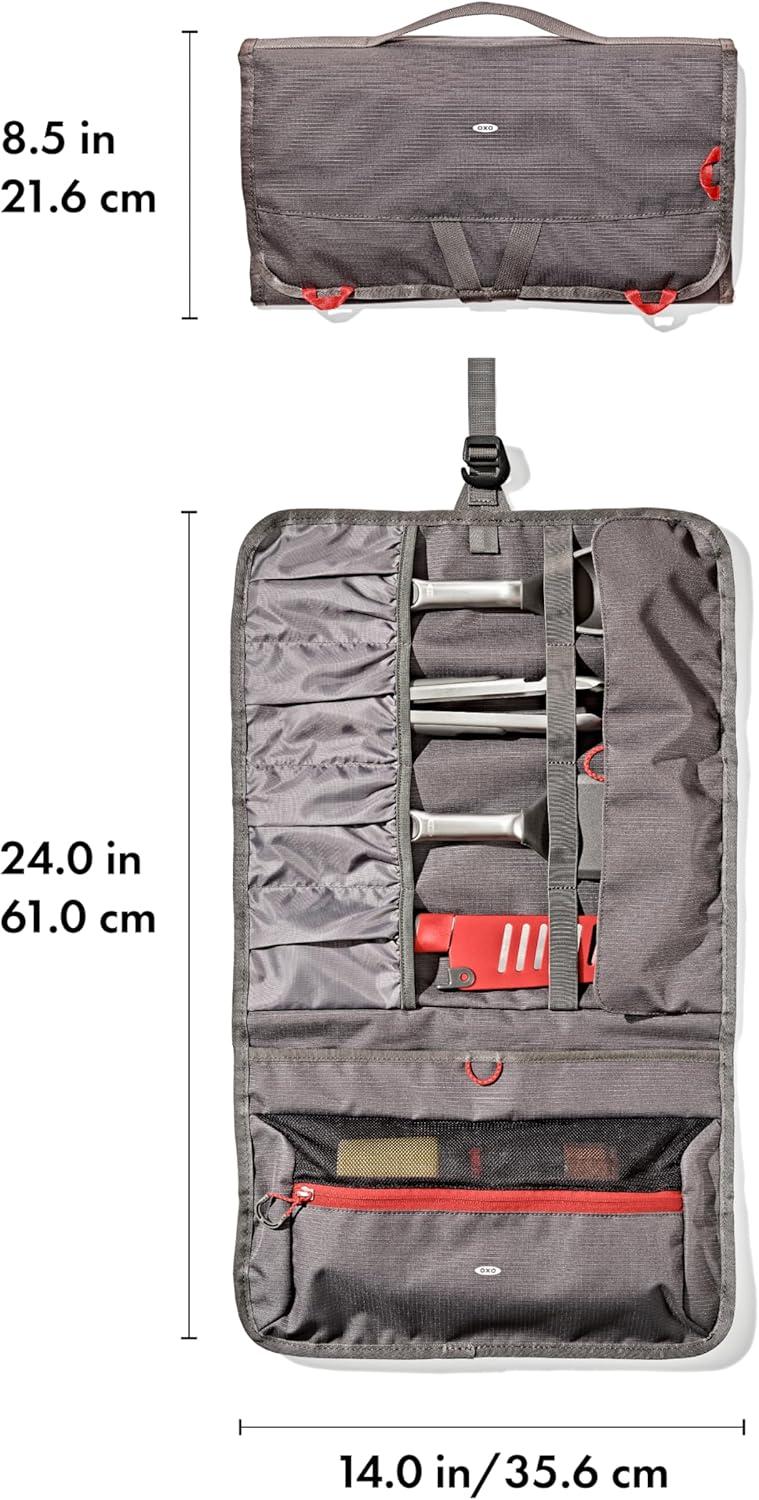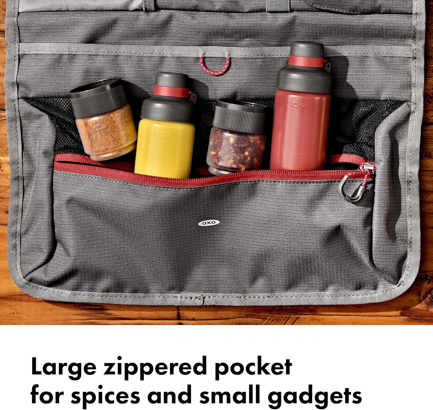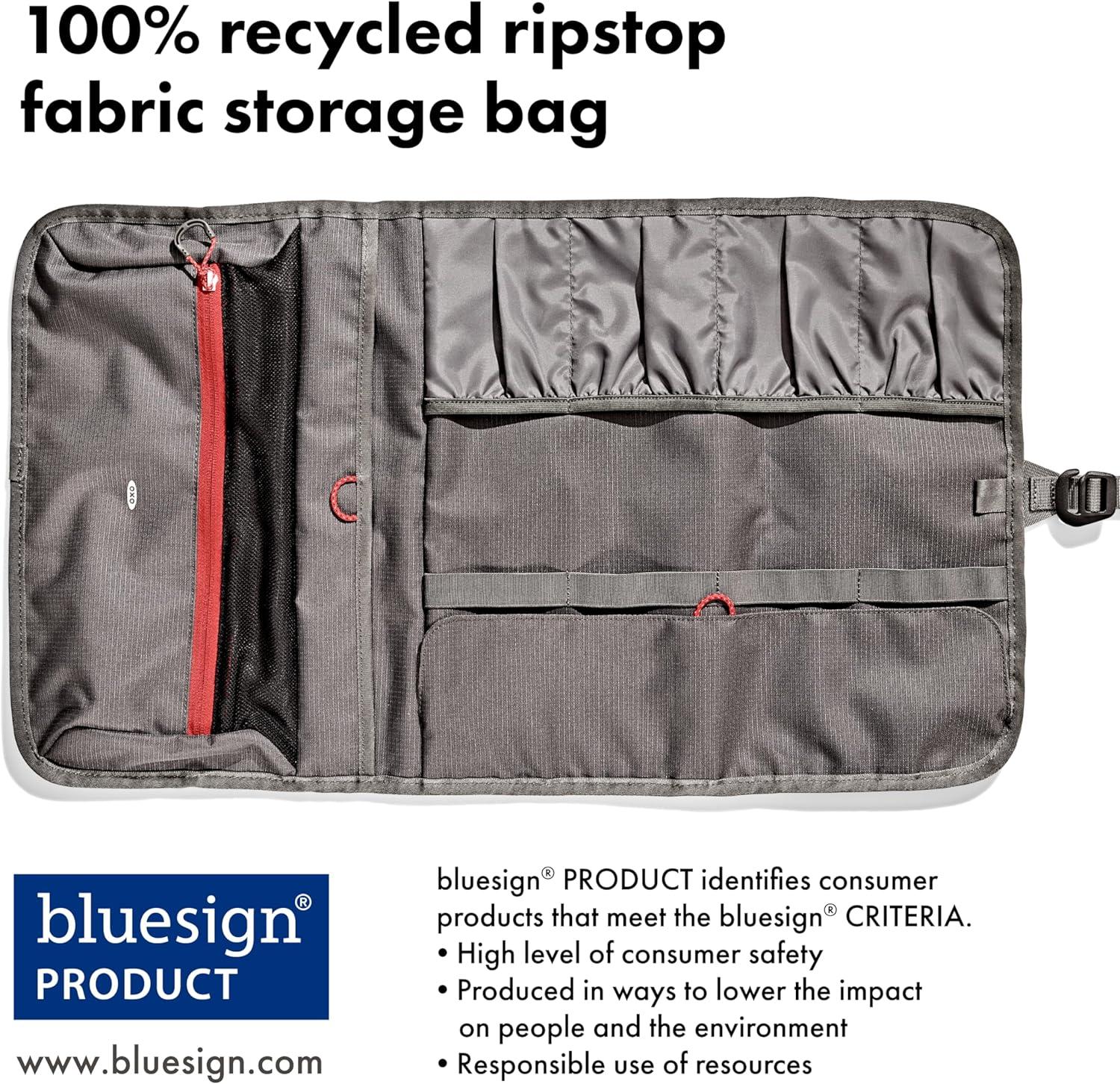 Kitchen gear stays put in your camp kit with the OXO Outdoor Camp Kitchen Tool Roll. Organize, store and transport all your kitchen gear in this soft-shell tool roll. Instead of throwing your tongs, spices, can openers and knives into a large bin where they’re hard to find or sharp to grab, use the neat pockets and compartments in this tool roll to keep your kitchen tools and gadgets organized and secure. The 100% recycled ripstop fabric storage bag resistant to stains and punctures, so you can pop your gear in here, roll it up and tighten it with the adjustable closure, then throw it into your bin with confidence that it will hold up on your adventures. There’s a large zippered pocket to secure small items like spice containers, condiments, sporks, corkscrews and other camp kitchen necessities that often get lost in a big bin. Four deep pockets have top and bottom covers to hold your cooking spoons, turners, tongs, knives and spatulas in place. And there’s an interior compartment for extra kitchen tools or condiment containers. Hang the bag by the durable fabric loops or the strap in your camp kitchen to easily access your kitchen essentials during meal prep at the campsite. Hang the bag from a camp kitchen rod, inside your tent or on the side of your camper. Stock up on OXO Outdoor kitchen tools or the OXO spice shakers and squeeze bottles to fill this tool roll. Standard-sized camp kitchen tools like tongs, spatulas, sheathed knives and turners fit in the four horizontal pickets of the tool roll. Tools shown in pictures are not included in package. Dimensions: 24 inches long x 14 inches wide /61 centimeters long x 36 centimeters wide. The main body fabric is made of 100% recycled polyester (with a durable coating). This product meets the bluesign® CRITERIA. bluesign® PRODUCT identifies consumer products that meet the bluesign® CRITERIA: High level of consumer safety; Produced in ways to lower the impact on people and the environment; Responsible use of resources: www.bluesign.com