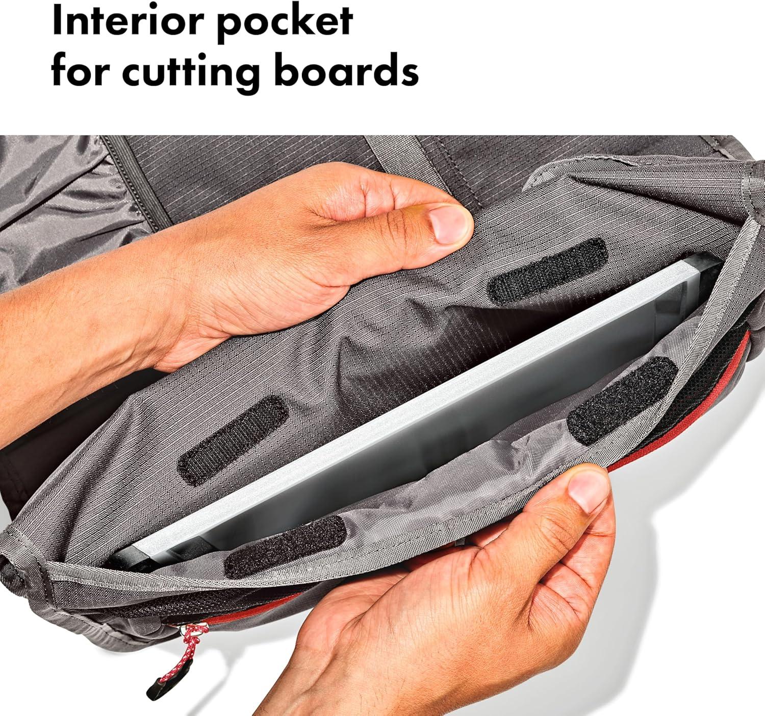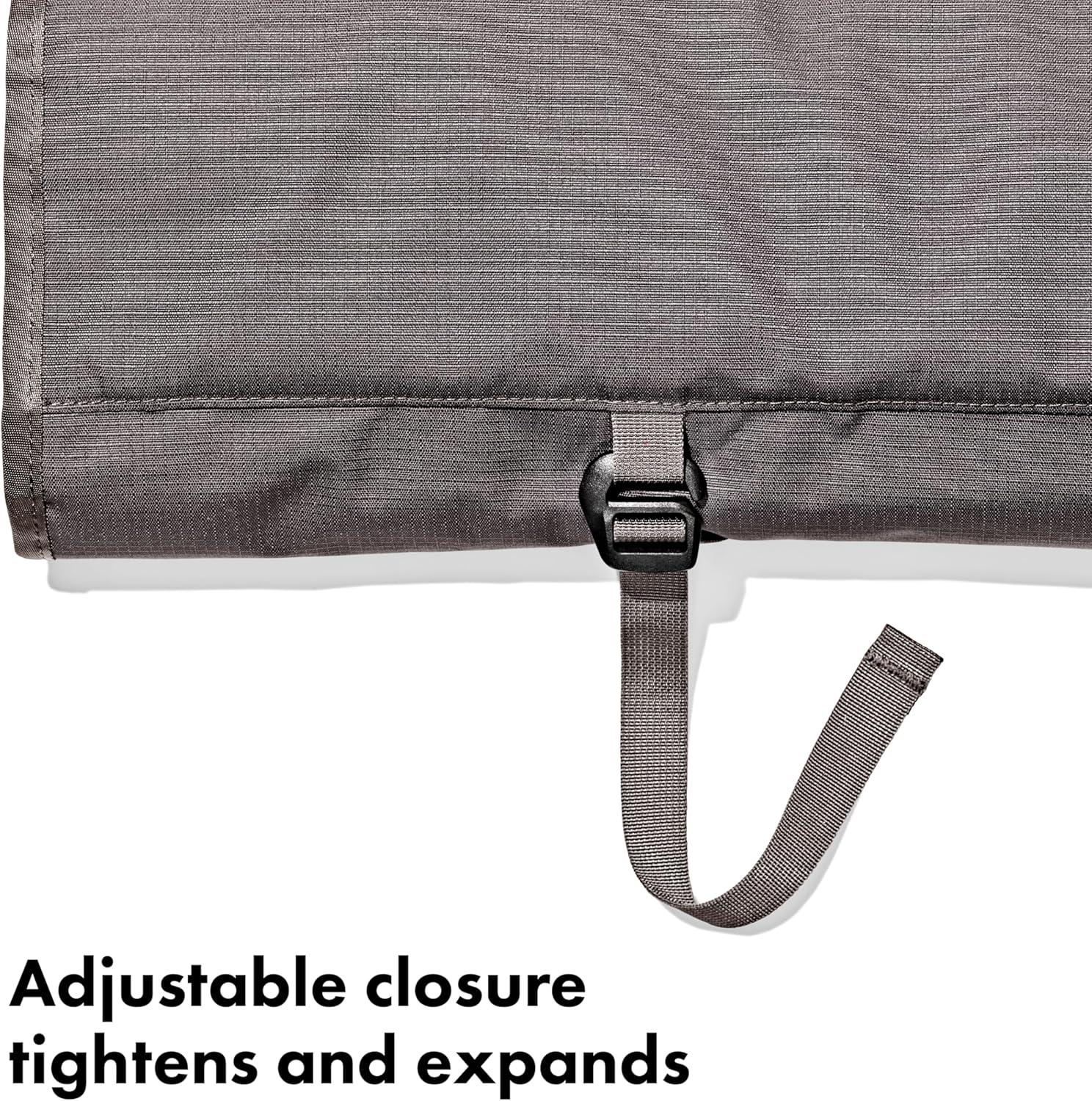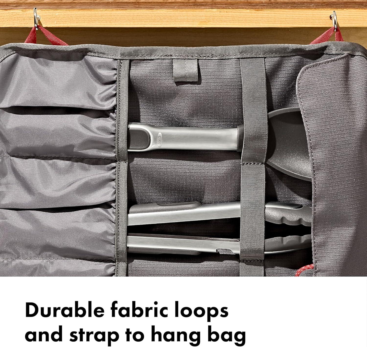 Kitchen gear stays put in your camp kit with the OXO Outdoor Camp Kitchen Tool Roll. Organize, store and transport all your kitchen gear in this soft-shell tool roll. Instead of throwing your tongs, spices, can openers and knives into a large bin where they’re hard to find or sharp to grab, use the neat pockets and compartments in this tool roll to keep your kitchen tools and gadgets organized and secure. The 100% recycled ripstop fabric storage bag resistant to stains and punctures, so you can pop your gear in here, roll it up and tighten it with the adjustable closure, then throw it into your bin with confidence that it will hold up on your adventures. There’s a large zippered pocket to secure small items like spice containers, condiments, sporks, corkscrews and other camp kitchen necessities that often get lost in a big bin. Four deep pockets have top and bottom covers to hold your cooking spoons, turners, tongs, knives and spatulas in place. And there’s an interior compartment for extra kitchen tools or condiment containers. Hang the bag by the durable fabric loops or the strap in your camp kitchen to easily access your kitchen essentials during meal prep at the campsite. Hang the bag from a camp kitchen rod, inside your tent or on the side of your camper. Stock up on OXO Outdoor kitchen tools or the OXO spice shakers and squeeze bottles to fill this tool roll. Standard-sized camp kitchen tools like tongs, spatulas, sheathed knives and turners fit in the four horizontal pickets of the tool roll. Tools shown in pictures are not included in package. Dimensions: 24 inches long x 14 inches wide /61 centimeters long x 36 centimeters wide. The main body fabric is made of 100% recycled polyester (with a durable coating). This product meets the bluesign® CRITERIA. bluesign® PRODUCT identifies consumer products that meet the bluesign® CRITERIA: High level of consumer safety; Produced in ways to lower the impact on people and the environment; Responsible use of resources: www.bluesign.com