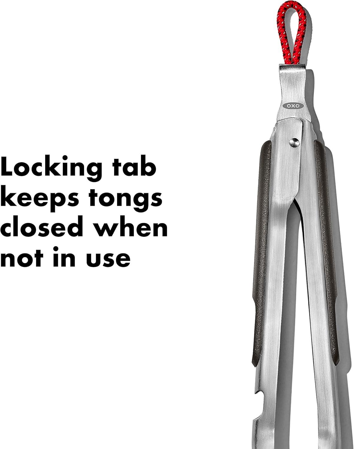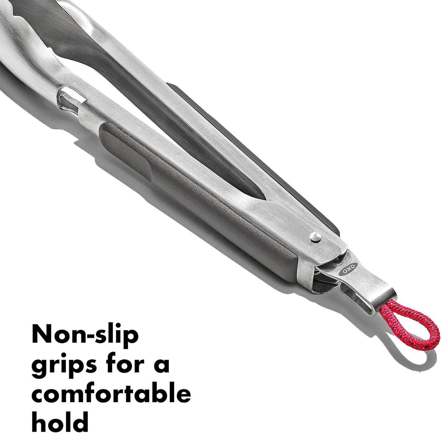 Get a grip on grilling with the OXO Outdoor 10.5-in Stainless Steel Tongs with Bottle Opener. The angled scalloped heads grab and hold onto food for safe turning and serving. The handles feature non-slip silicone touchpoints, and there’s a locking tab to keep the Tongs closed when not in use. The best part: The Tongs have a built-in bottle opener for campsite convenience. Dishwasher safe.