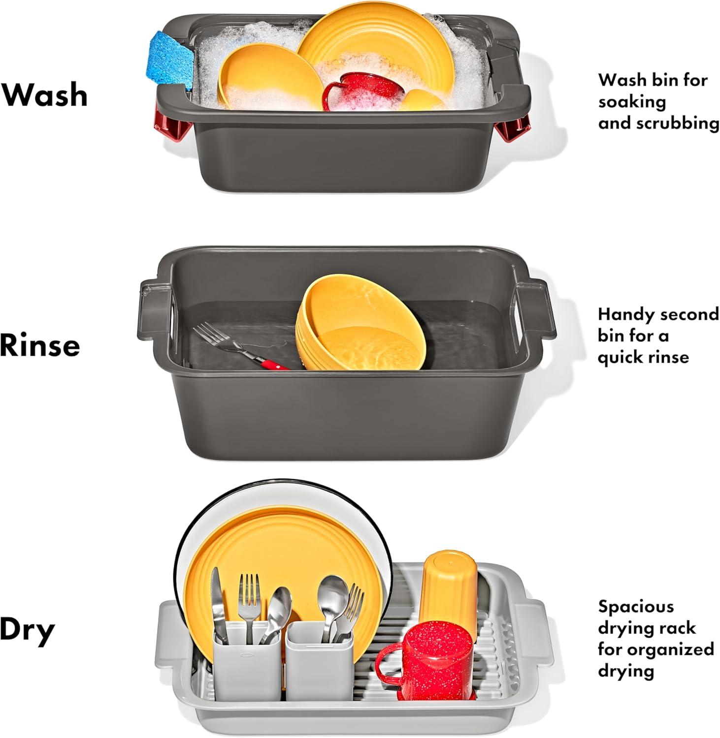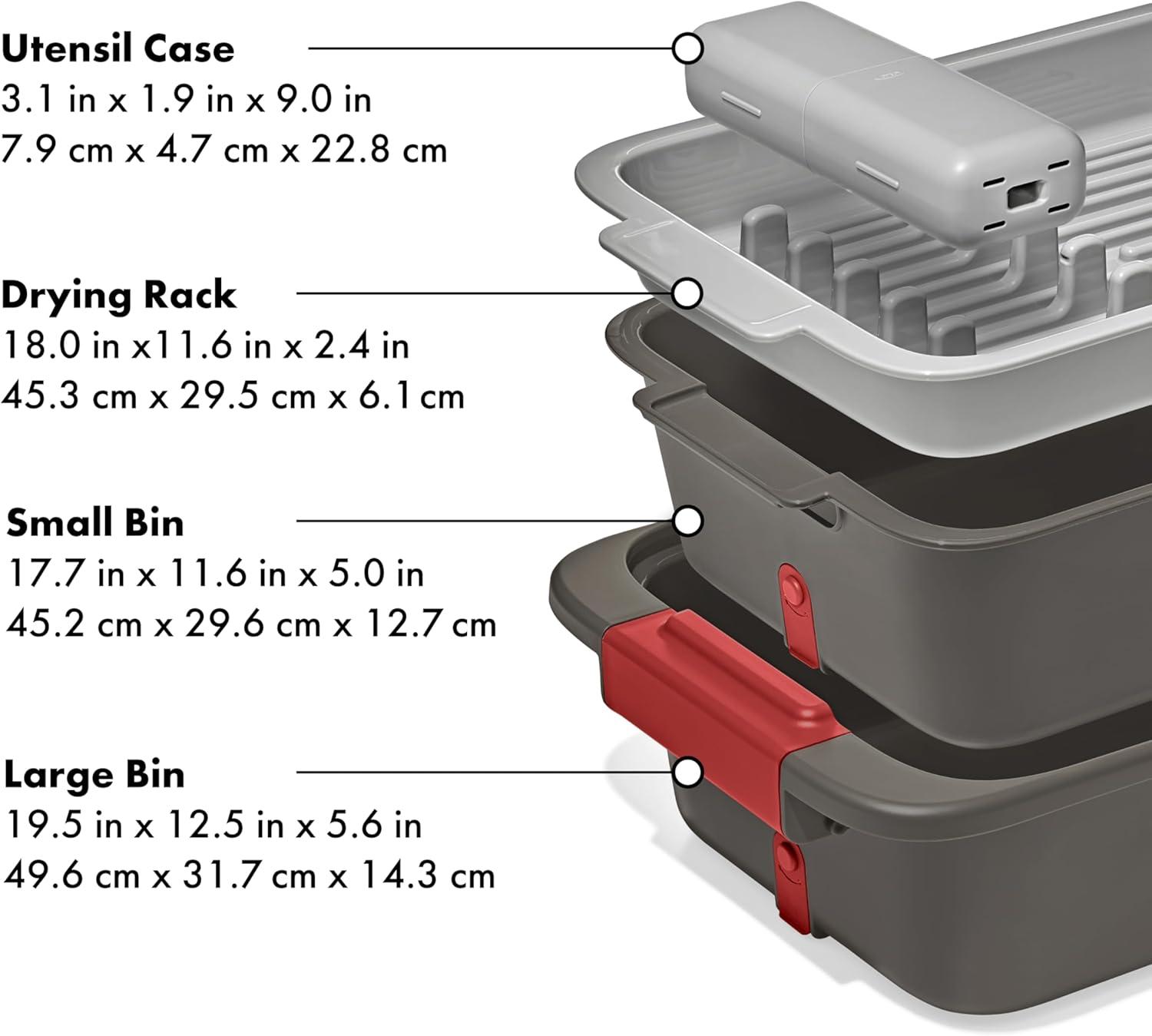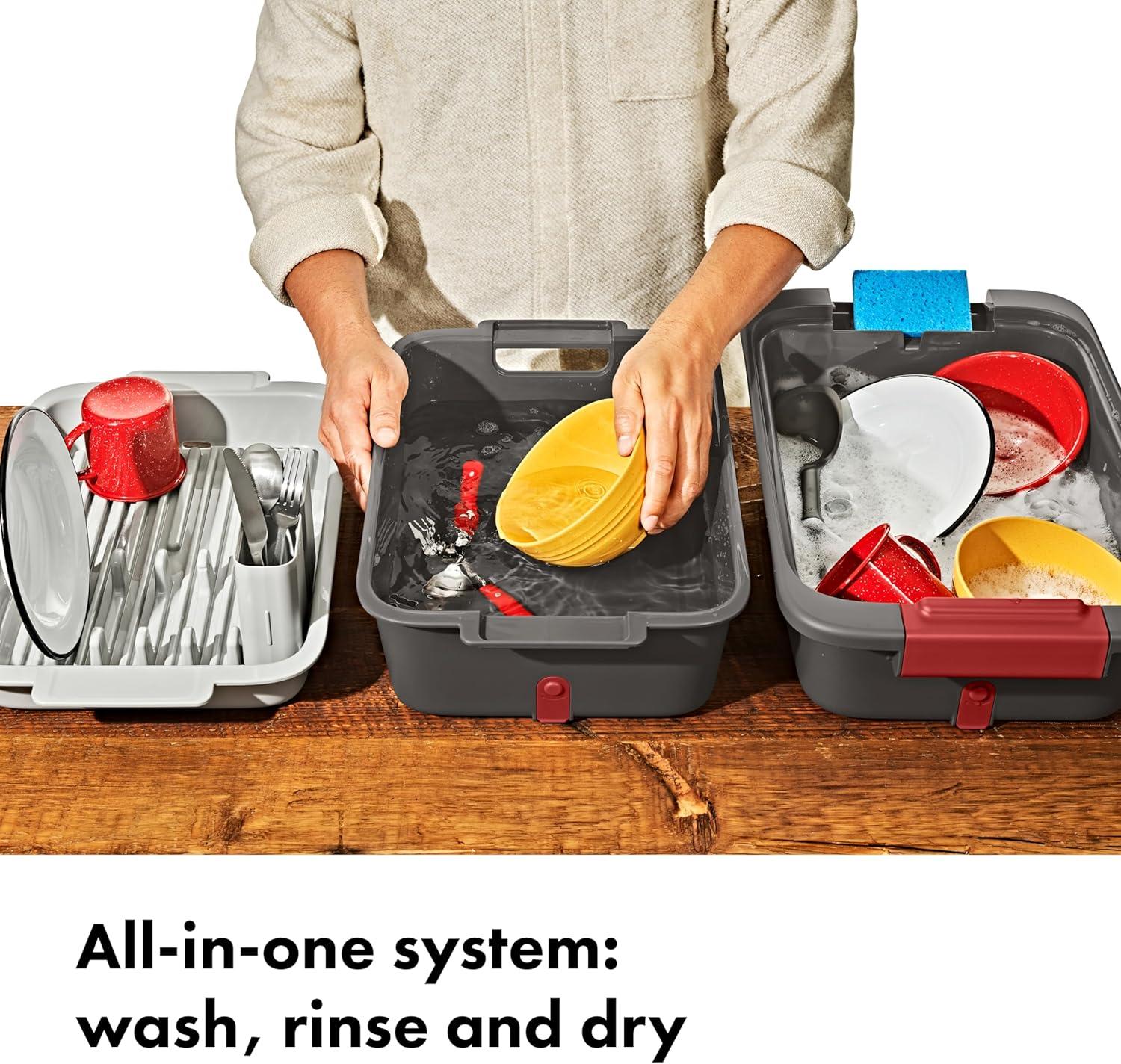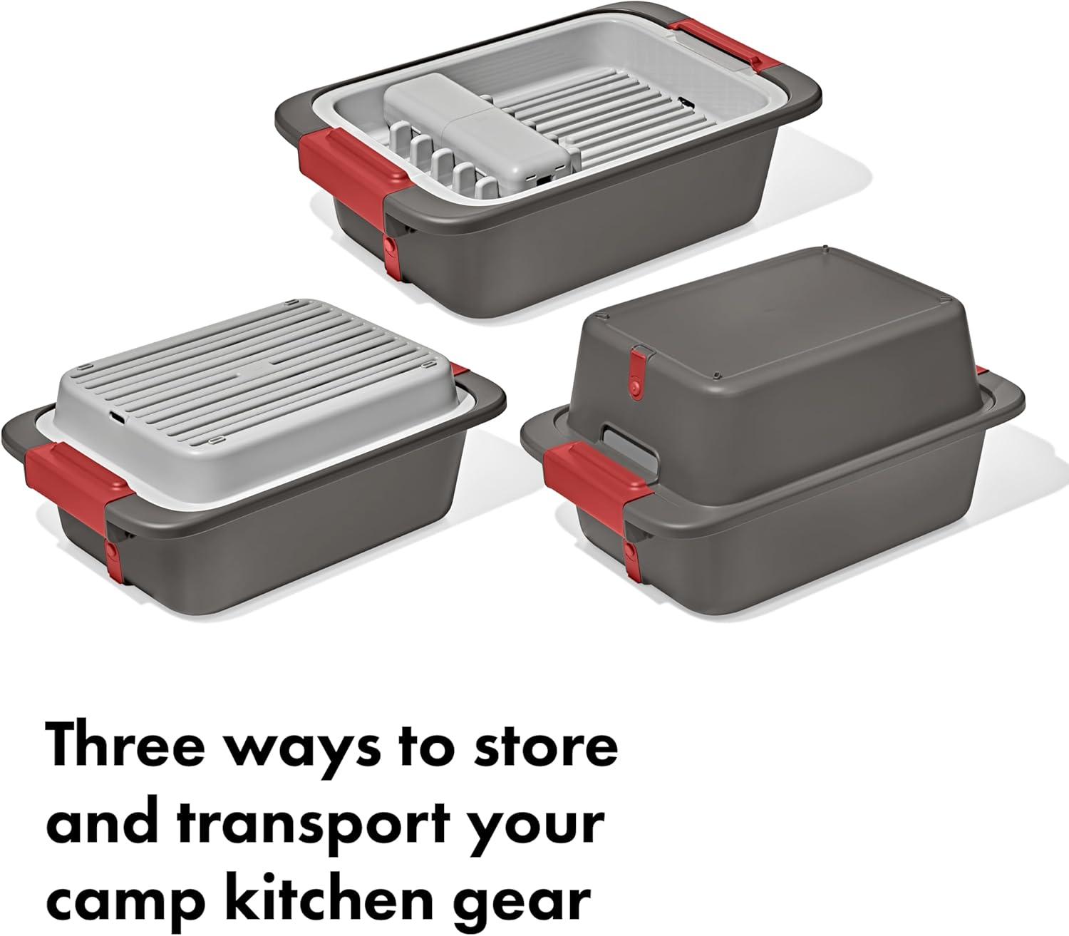 The OXO Outdoor Wash, Dry & Stow System is a self-contained system designed to help make cleaning, drying, storing, and transporting your campsite cooking gear easier and more efficient. This 4-piece set includes two spacious bins, a utensil case, and a drying rack. The deep bin is perfect for soaking and scrubbing your camp kitchen gear, and the second bin is handy for a quick rinse. The bins feature silicone stoppers and removable drainage filters to release dish water without releasing larger food particles. The spacious drying rack can hold plates, cups, bowls, pots and pans and has grooves in the base for airflow and quick drying. The convenient utensil holder can fit four forks, four knives, and four spoons, and it also comes apart and snaps into dish rack for efficient drying. When you’re done, the utensil holder snaps onto the drying rack, and the rack and bins all nest for compact storage.