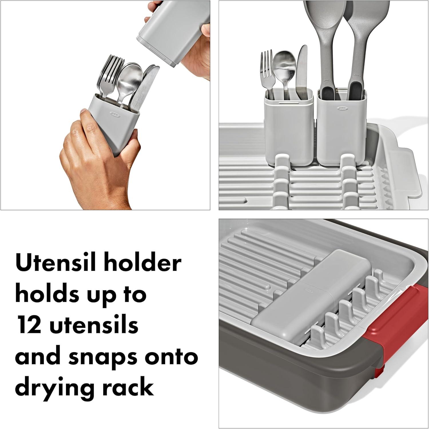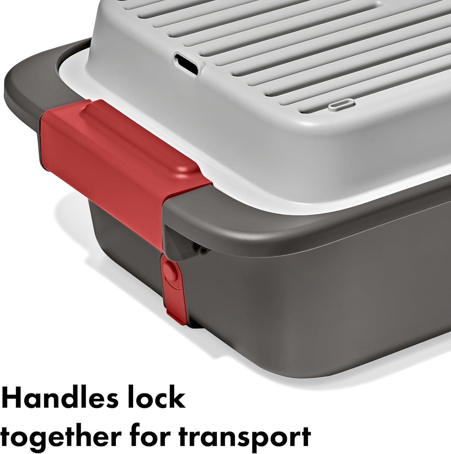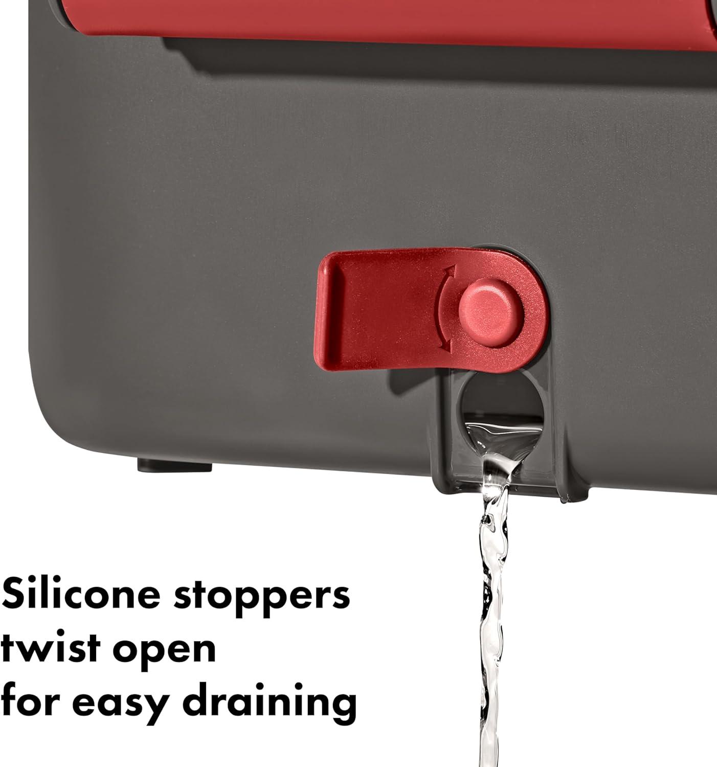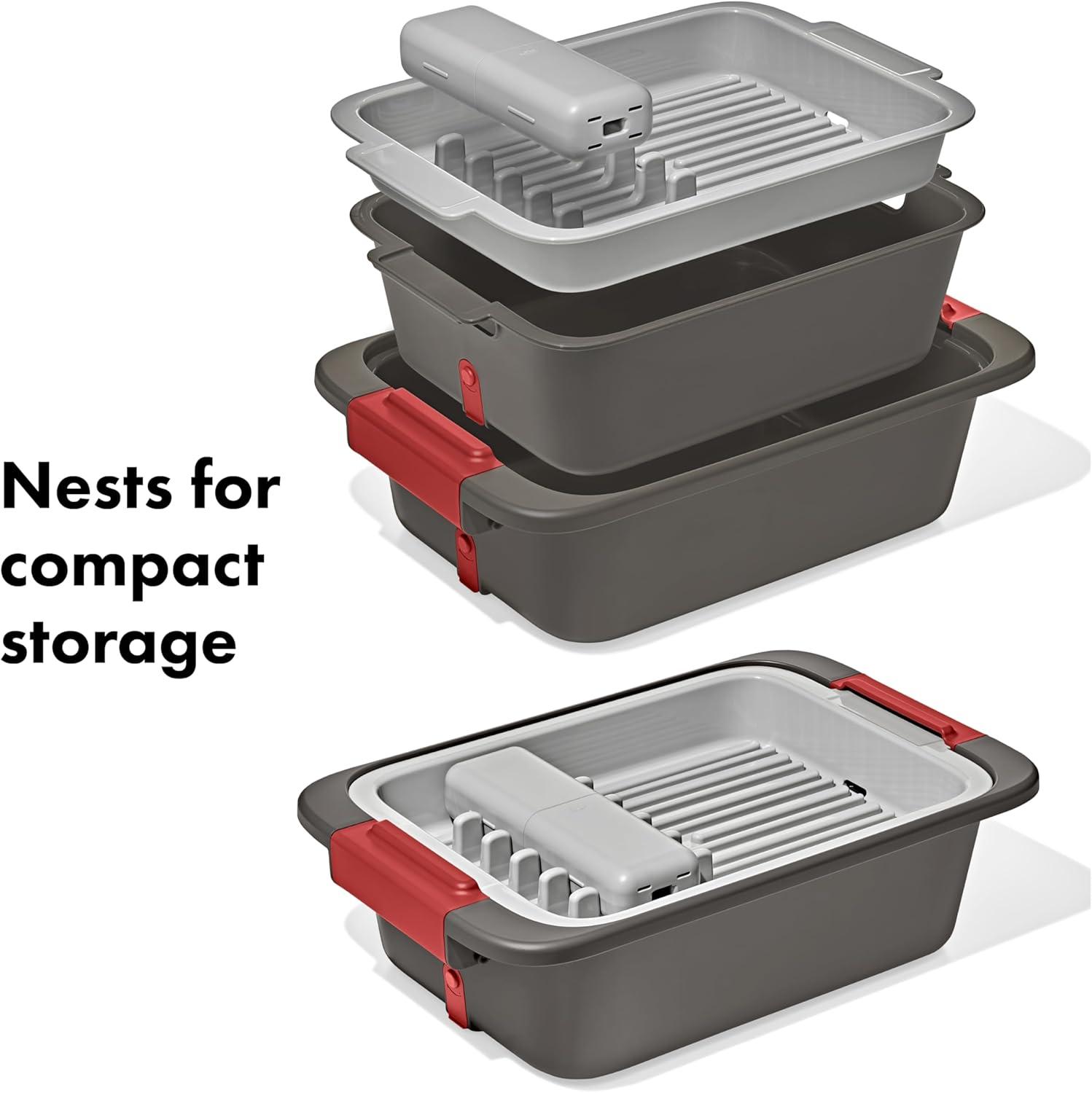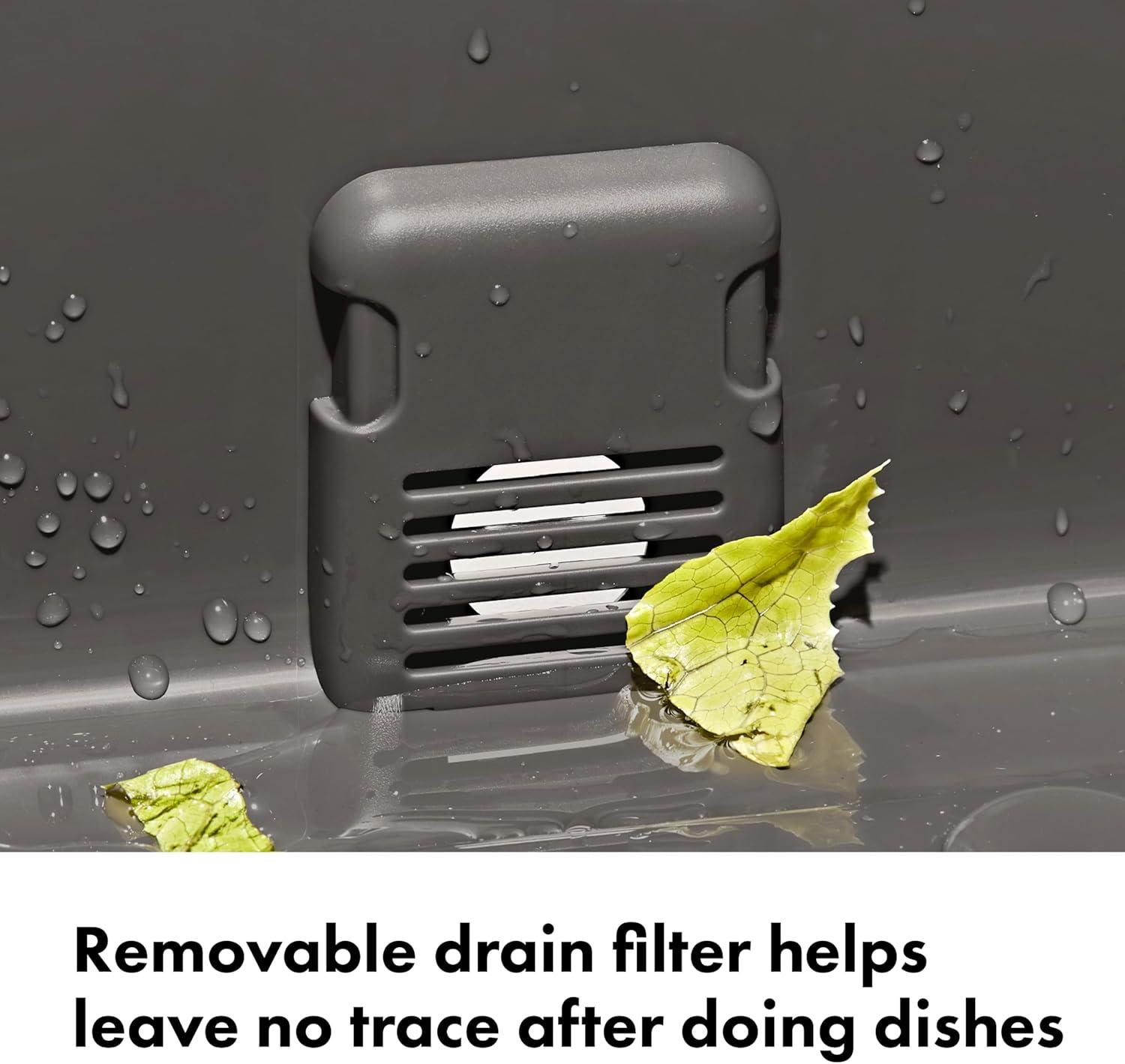 The OXO Outdoor Wash, Dry & Stow System is a self-contained system designed to help make cleaning, drying, storing, and transporting your campsite cooking gear easier and more efficient. This 4-piece set includes two spacious bins, a utensil case, and a drying rack. The deep bin is perfect for soaking and scrubbing your camp kitchen gear, and the second bin is handy for a quick rinse. The bins feature silicone stoppers and removable drainage filters to release dish water without releasing larger food particles. The spacious drying rack can hold plates, cups, bowls, pots and pans and has grooves in the base for airflow and quick drying. The convenient utensil holder can fit four forks, four knives, and four spoons, and it also comes apart and snaps into dish rack for efficient drying. When you’re done, the utensil holder snaps onto the drying rack, and the rack and bins all nest for compact storage.