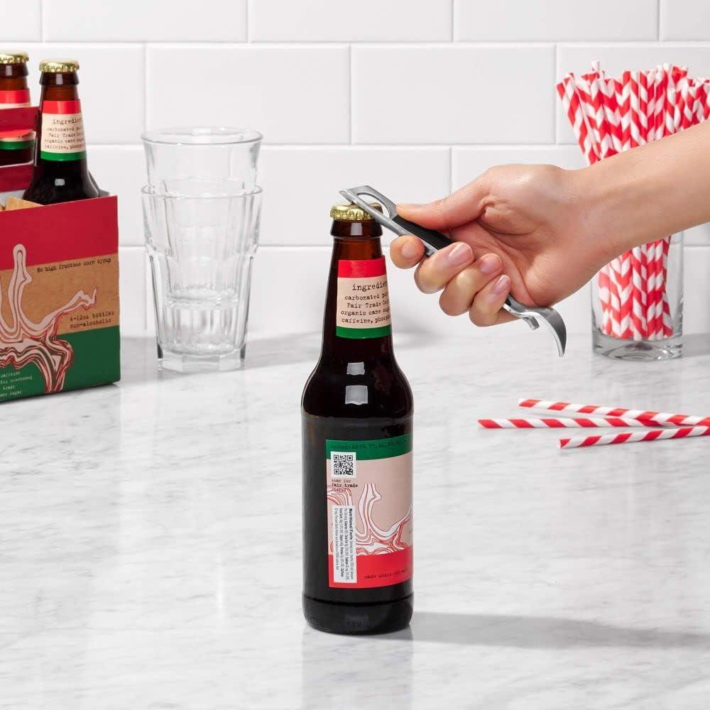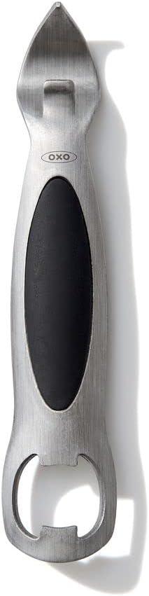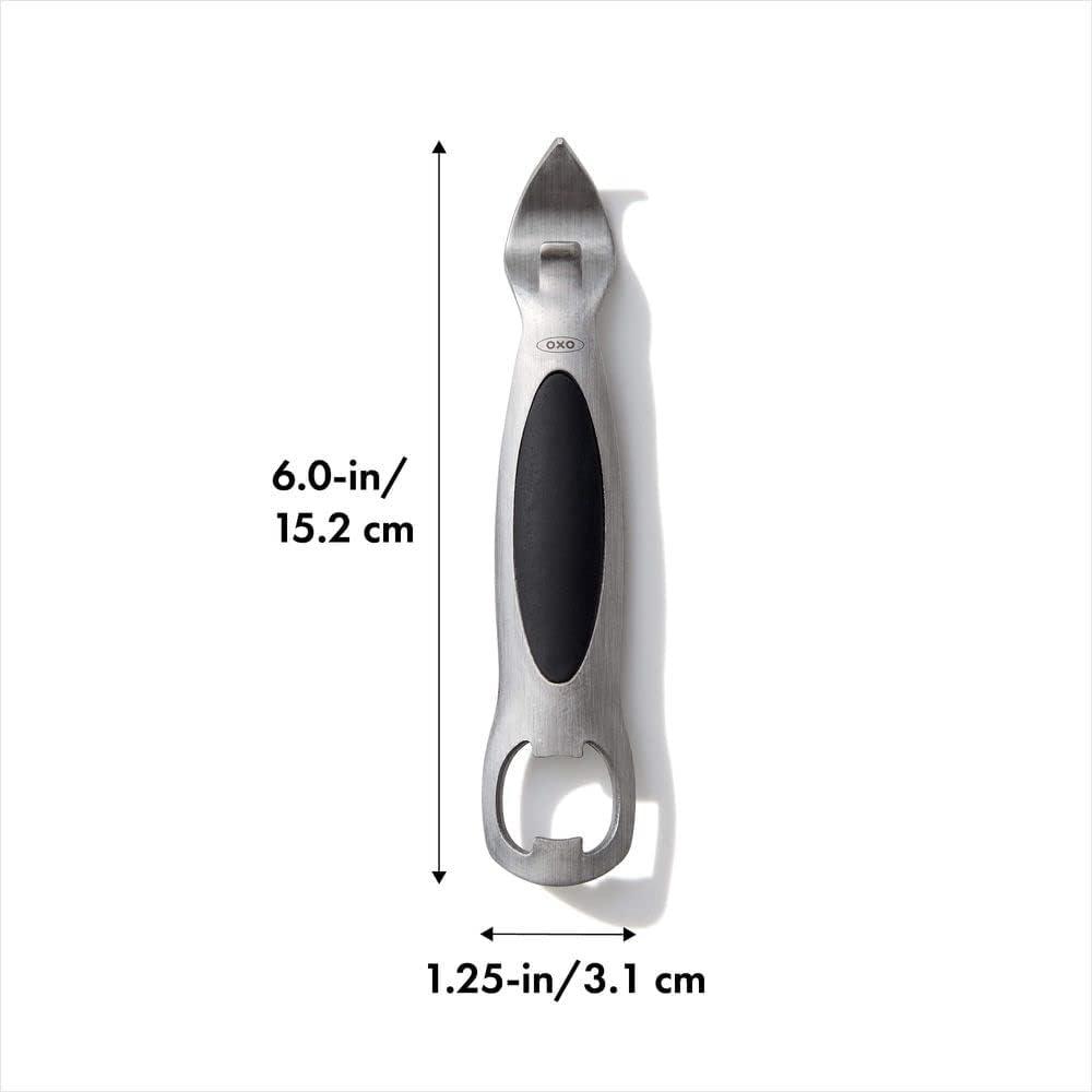 Sleek lines, soft curves and brushed stainless steel bring function and style to the OXO steel bottle opener. The bottle opener has two functional ends, one for opening bottles and the other for punching cans. Soft, non-slip grip.