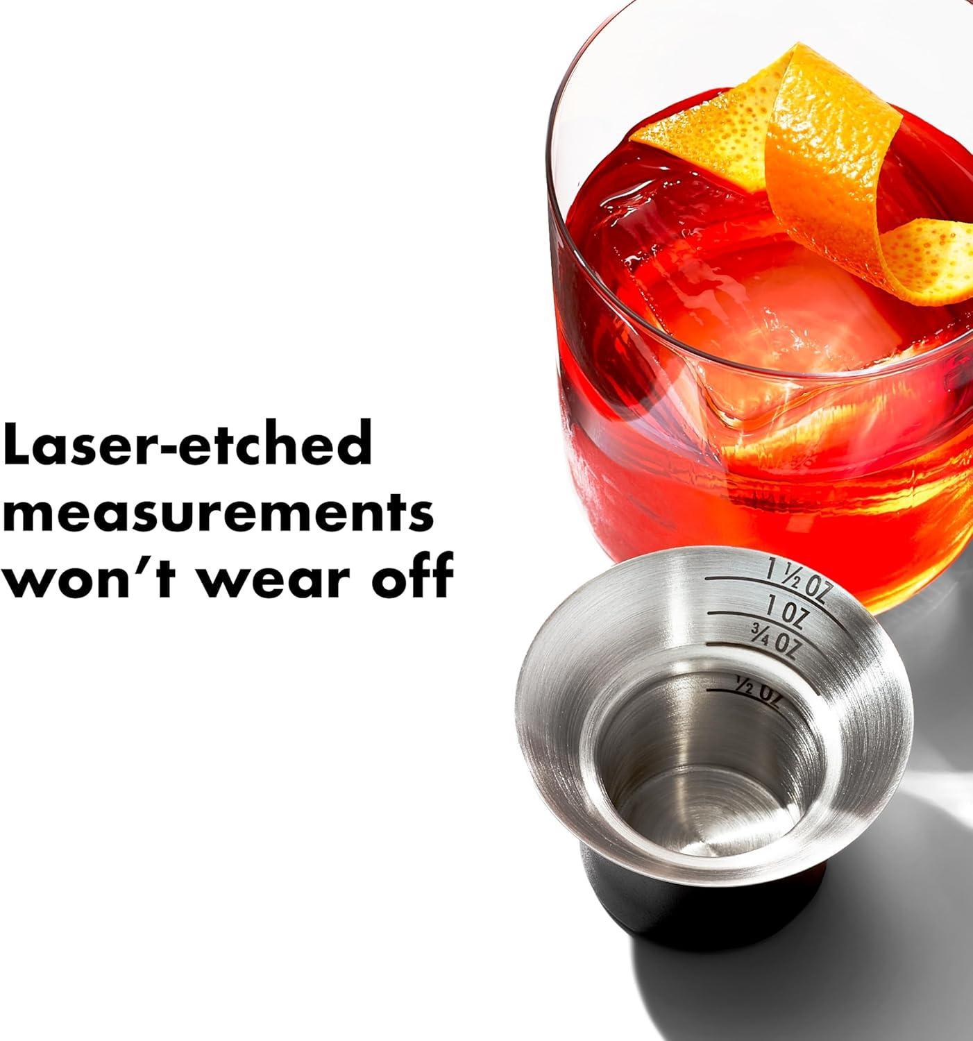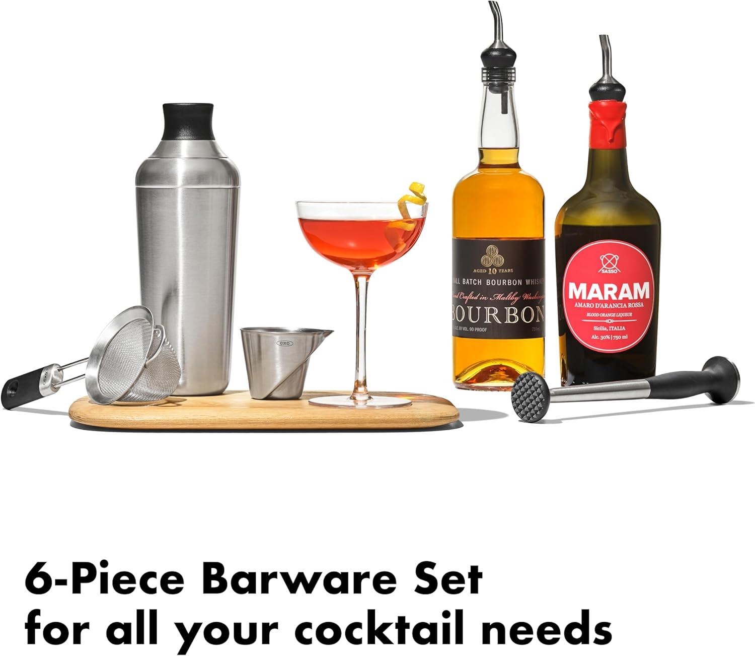 Craft cocktails at home like a pro with the OXO Steel 6-Piece Barware Set. With six durable, stainless steel tools, you’ll be ready to mix up your favorite cocktails (or mocktails!) for friends and family in no time. The Single-Wall Cocktail Shaker features two tight silicone gaskets to help prevent leaks while shaking and has a smooth-release design to prevent sticking. It features a built-in strainer for a smooth pour and the cap doubles as another useful jigger. Use the Muddler to gently extract the delicious flavors of fruit and herbs or use it to prep holds a large amount to keep your drinks clear of small bits of fruit and ice chips. Bonus: the strainer can also be used for straining loose tea leaves. The Angled Jigger is designed so you can see your measurements as you pour – no more bending or holding the Jigger up high. Also included in the set are two Shot Pourers that ensure precise pouring of liqueurs or flavored syrups and have a tight fit that prevent drips. The Barware Set’s sleek stainless steel finish adds sophistication to the home bar cart and comes in an attractive giftable box that is perfect for registries and gifting. The pieces all have comfortable, non-slip grips and are dishwasher safe.
