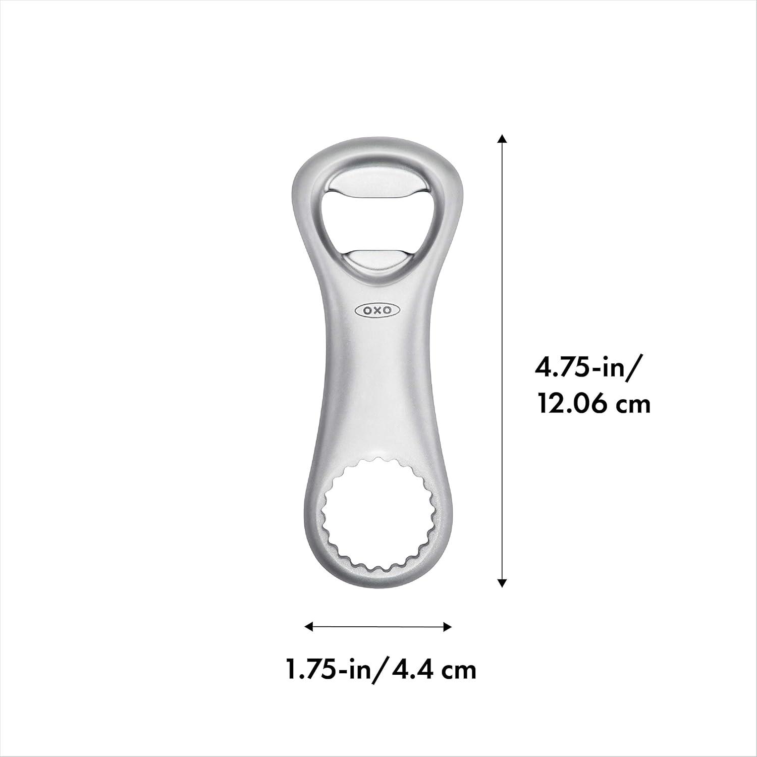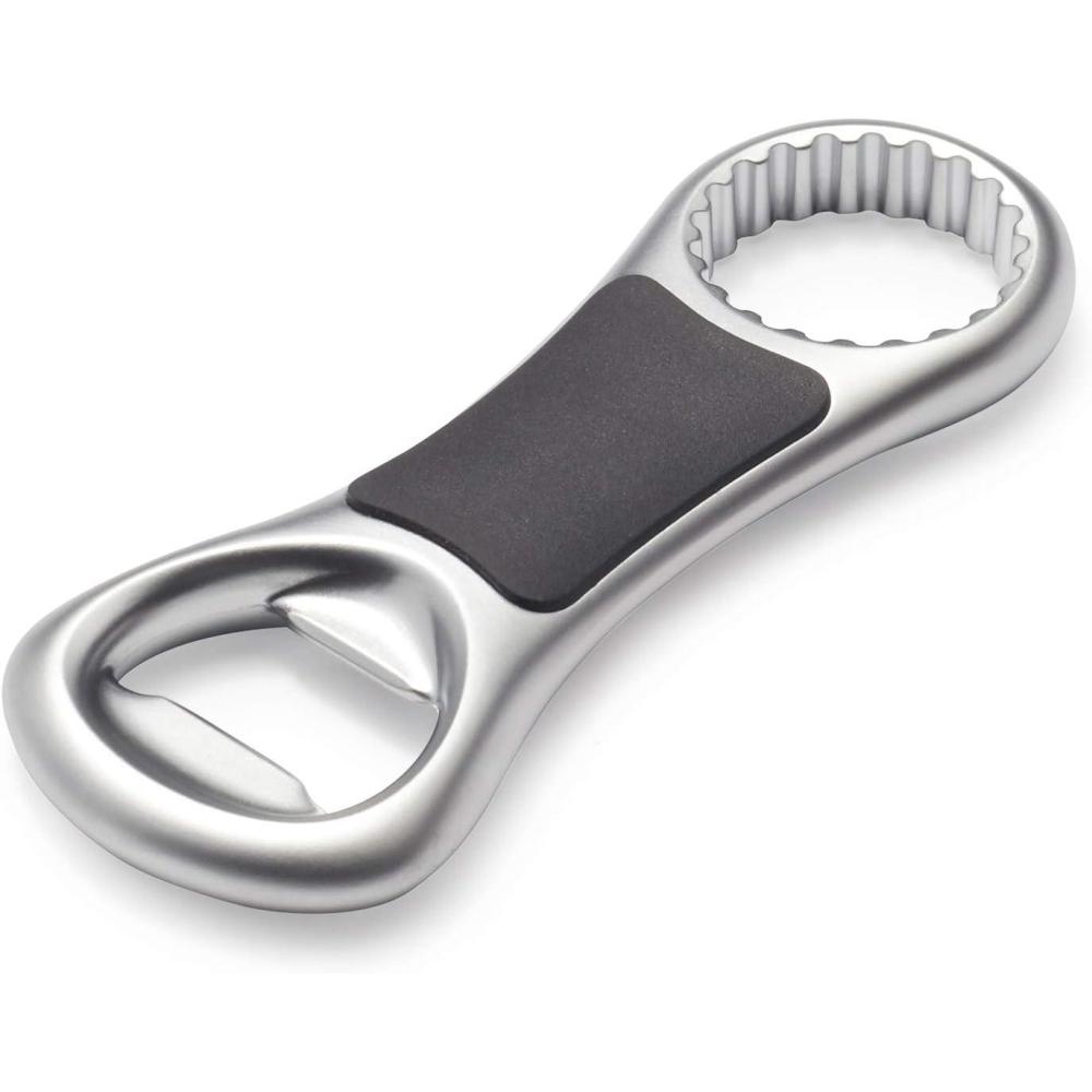The die-cast bottle opener opens pop-top and twist-top beer and soda bottles with ease. The pop-top side opens metal caps with a flick of the wrist, and the twist-top side grips onto metal bottle cap teeth for effortless opening. With a non-slip, comfortable touchpoint great for opening lots of glass bottles, and sturdy die-cast zinc to last a lifetime of parties.
