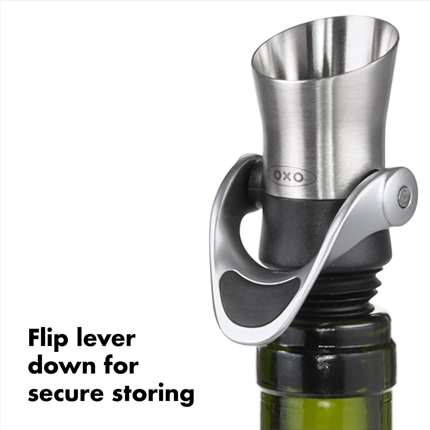 The OXO Steel Wine Stopper/Pourer Combination is the perfect two-in-one gift for anyone from the wine connoisseur to the casual entertainer. Combining function and elegance, the sleek, brushed stainless steel Stopper/Pourer Combination reduces drips and spills while pouring and allows for even and consistent wine flow. Push the soft, comfortable lever down and the bottle is sealed for short-term storage. Lift the lever up and the seal is opened for drip-free pouring. Wine is also aerated while it is poured out of the wide spout. Flexible ribs make the Stopper/Pourer Combination easy to remove from and place in to the bottle. The Stopper/Pourer Combination accommodates all size wine bottles and is dishwasher safe.