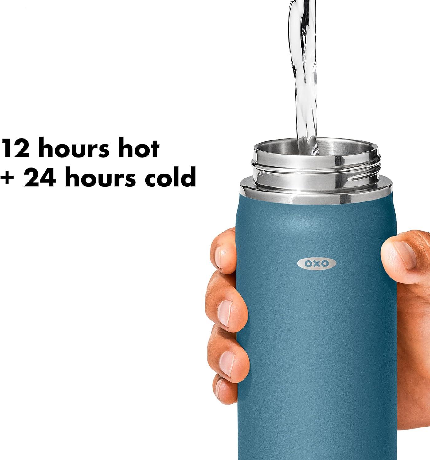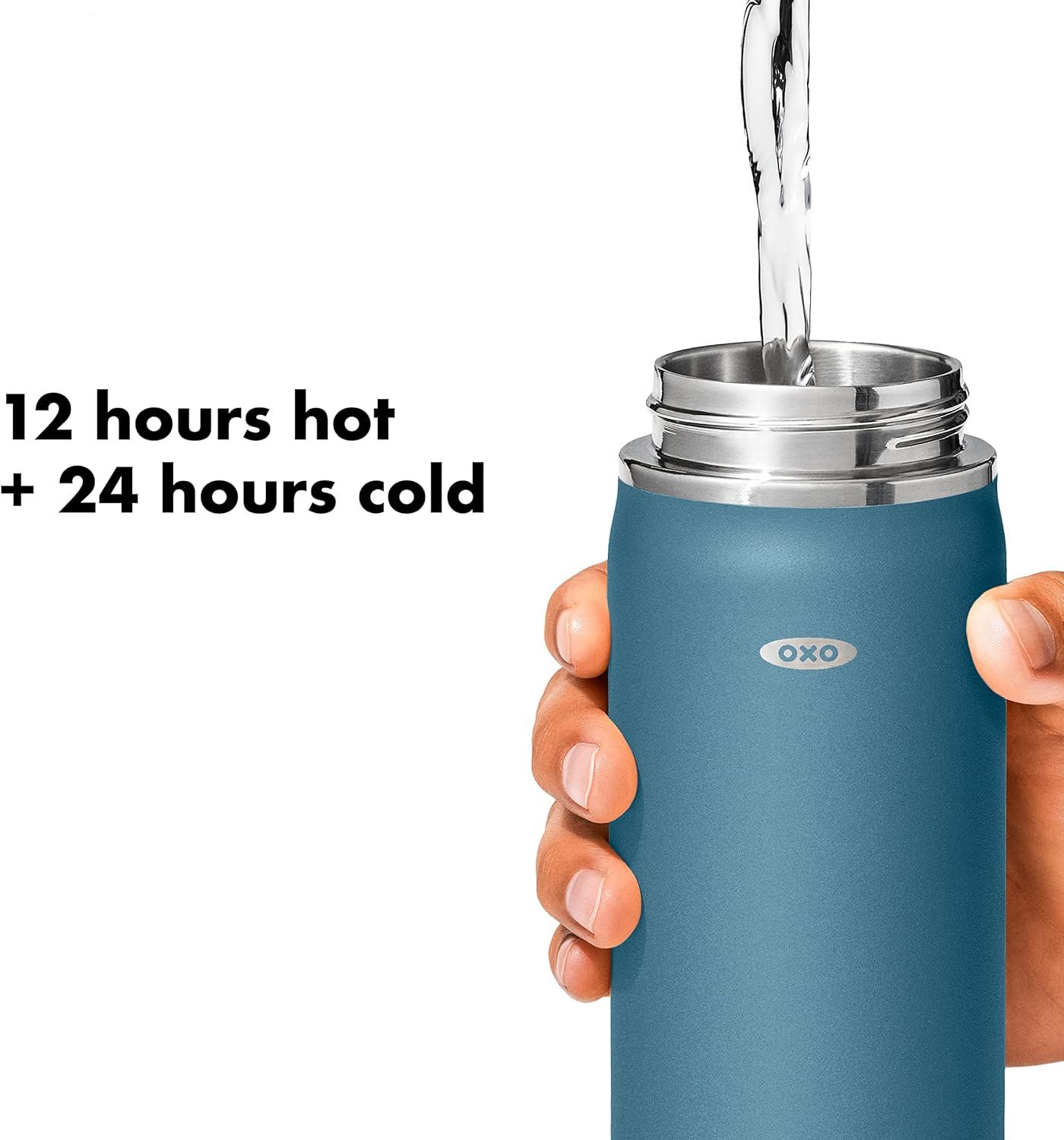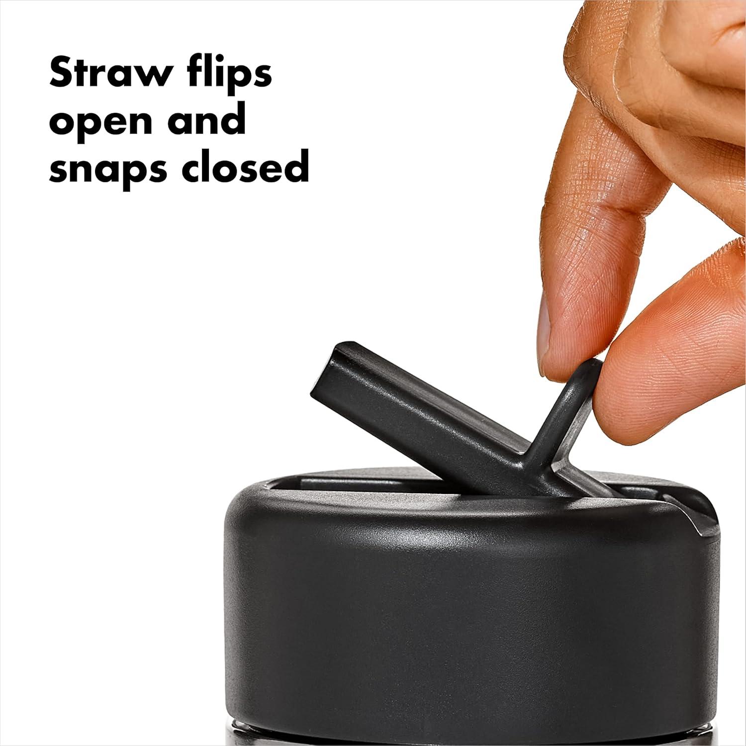 Sip with confidence knowing your drink will still be cold (or hot!) with the OXO Strive 24 oz/710 mL Insulated Wide Mouth Water Bottle with Straw Lid The Insulated Water Bottle is sized to fit most car cup holders and features a non-slip, sweatproof coating for a comfortable grip. The easy-to-clean lid features a removable silicone gasket, and the straw flips open for quick access and snaps closed to help prevent spills. Stainless steel, double-wall vacuum insulation keeps drinks cold for 24 hours or hot for 12 hours. The bottle and lid are dishwasher safe. BPA free.