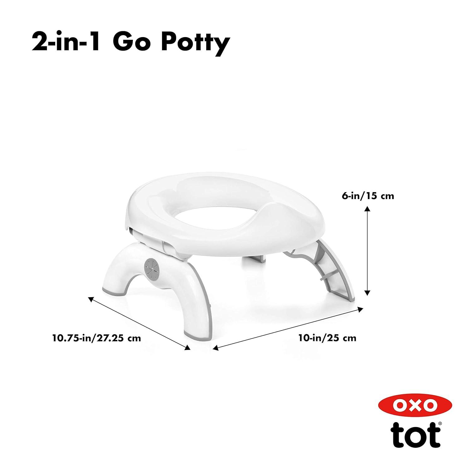 Be prepared for on-the-go potty emergencies with the OXO Tot 2-in-1 Go Potty. The Potty opens quickly and easily and works alone (with disposable bags), or as a seat that rests on top of toilets. The legs lock at the ideal height for growing tots, and soft, flexible flaps hold disposable bags securely in place. Three disposable bags with absorbent pads are included, and refills are available, plus the Potty can accommodate standard plastic bags in a pinch. The legs fold all the way out and non-slip grips keep the Potty stable on round or elongated public toilets. The small seat is sized for little bottoms and the generous shield prevents splatter. The smooth surfaces are easy to clean and the legs fold in, allowing the Potty to fit into the included travel bag for storage in cars, strollers or diaper bags.