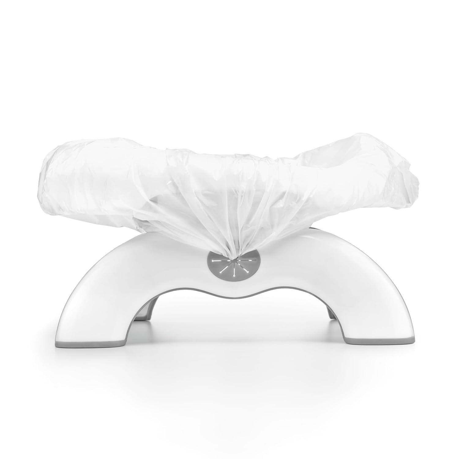 Absorbent, leak-proof bags attach securely to potty's soft, flexible flaps