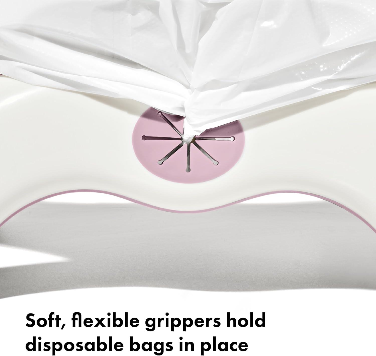 Be prepared for on-the-go potty emergencies with the OXO Tot 2-in-1 Go Potty. The Potty opens quickly and easily and works alone (with disposable bags), or as a seat that rests on top of toilets. The legs lock at the ideal height for growing tots, and soft, flexible flaps hold disposable bags securely in place. Three disposable bags with absorbent pads are included, and refills are available, plus the Potty can accommodate standard plastic bags in a pinch. The legs fold all the way out and non-slip grips keep the Potty stable on round or elongated public toilets. The small seat is sized for little bottoms and the generous shield prevents splatter. The smooth surfaces are easy to clean and the legs fold in, allowing the Potty to fit into the included travel bag for storage in cars, strollers or diaper bags.