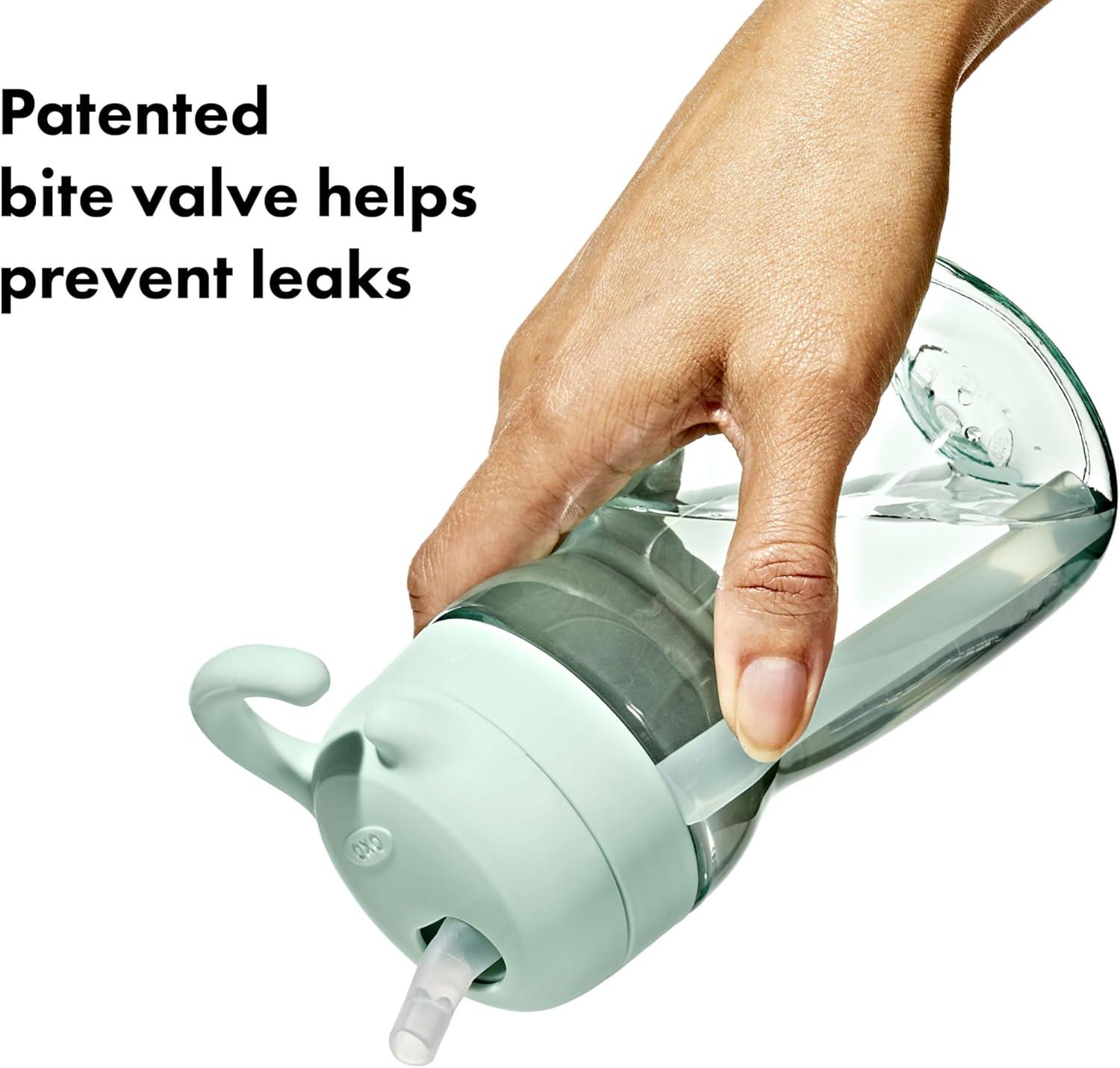 Staying hydrated on the go doesn't have to be hard. With the OXO Tot Adventure Water Bottle, you can let kids sip without worrying about making a mess. This 12-oz water bottle features a patented, spill-proof straw that helps put an end to leaks, drips and dribbles. The bite valve opens the moment your child's lips touch the straw, so it's easy for kids who want to do everything on their own. Tots can open the straw lid with a twist, while grown-ups will have no trouble separating the two-part hinged cap for a thorough cleaning. The bottle's hourglass shape fits just right in little hands, so kids can carry it anywhere. The flex-tip hook attaches securely to diaper bags, backpacks and more, so it's a snap to bring this bottle with you on all your adventures.
