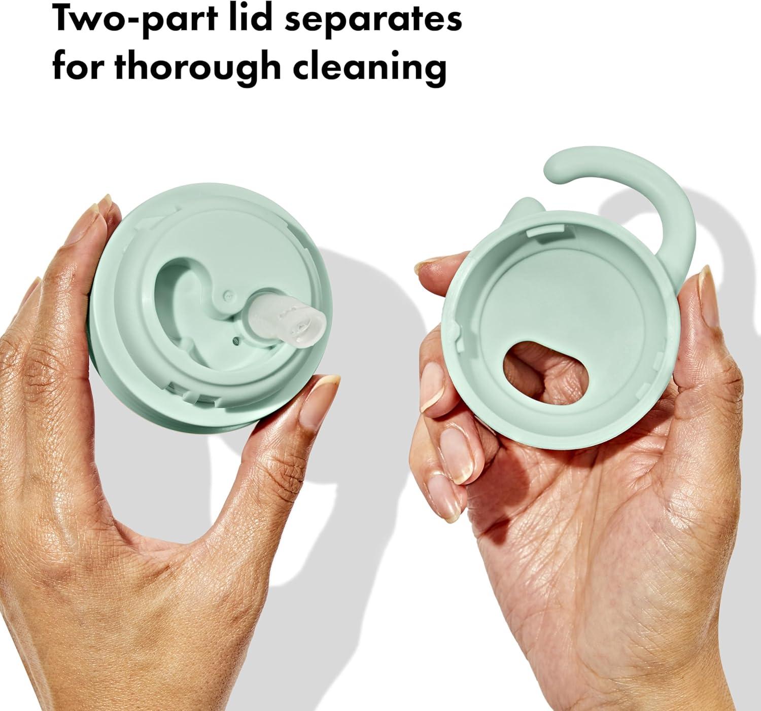 Two-part hinged cap removes easily for adults and separates for cleaning