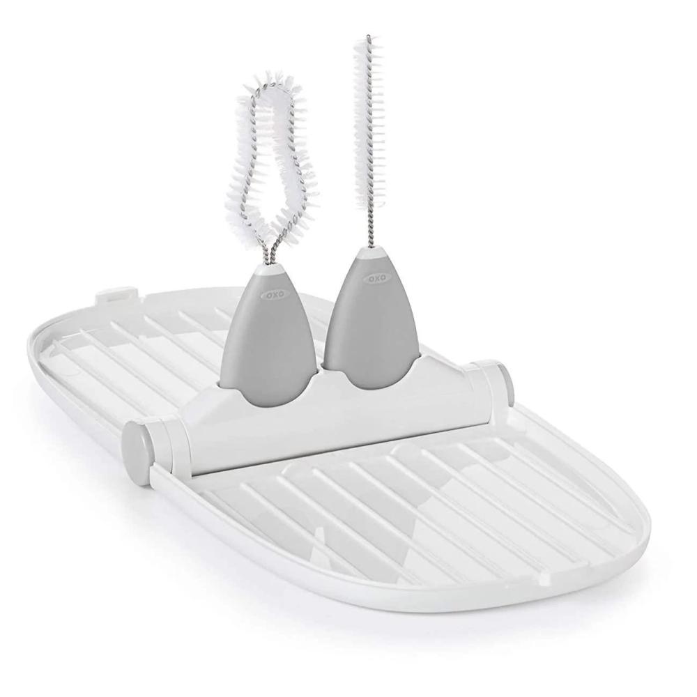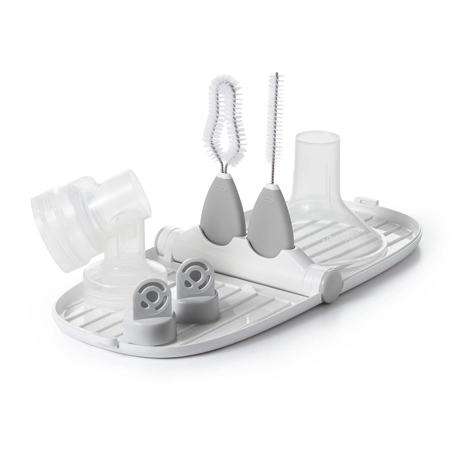 The compact and thoughtfully designed OXO Tot Breast Pump Parts Drying Rack features elevated ridges and prongs to keep parts elevated above water for quick drying. Includes 2 brushes designed specifically for cleaning breast pump parts.
