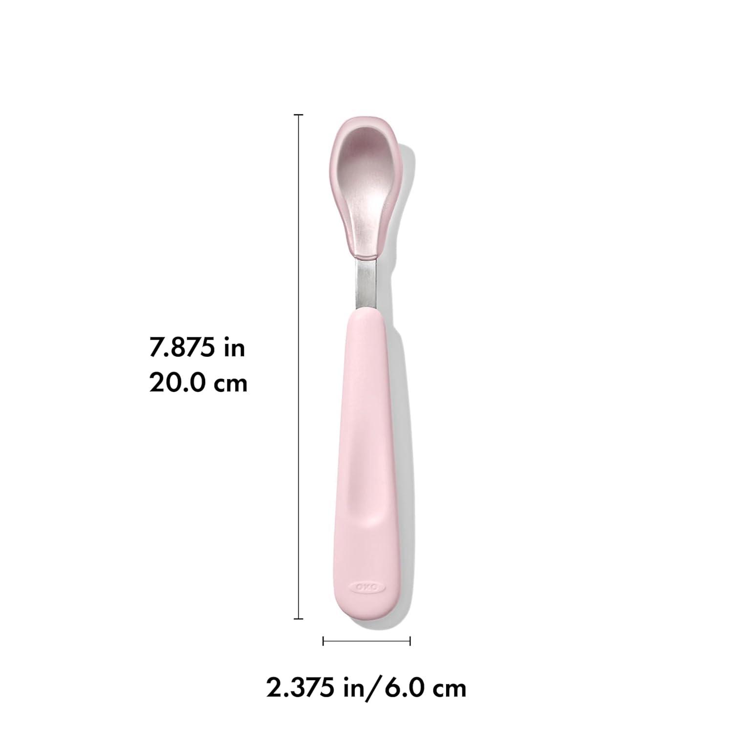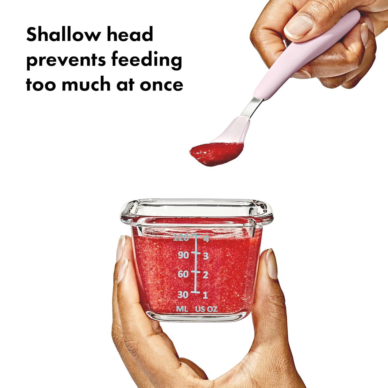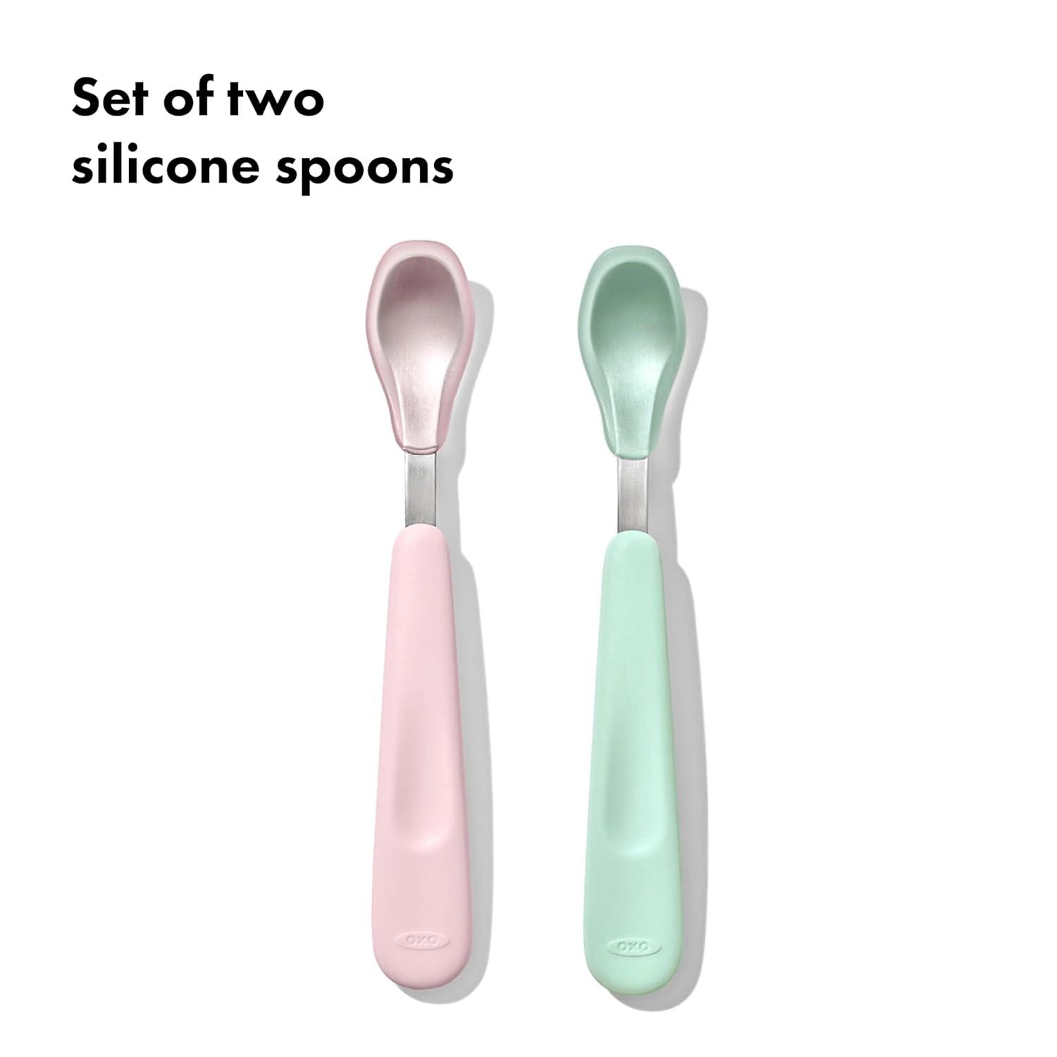 The OXO Tot Feeding Spoons Set is a solid choice for solid foods. The Spoon’s heads are sized for baby’s mouth, and the soft silicone is comfortable on your little one’s gums. The contoured handle is designed for easy gripping, and the shallow tips prevent feeding too much at one time. Suitable for children 6 months and up. Dishwasher safe.