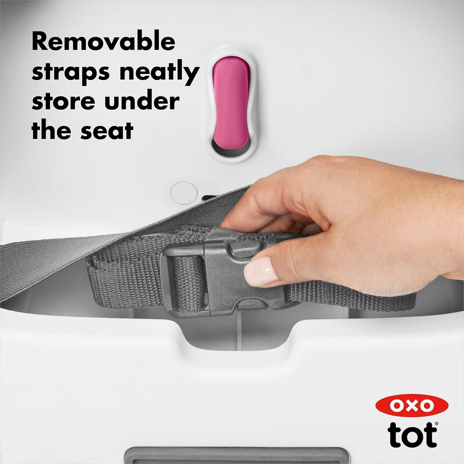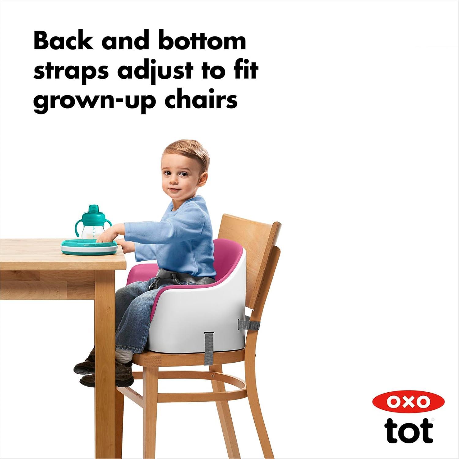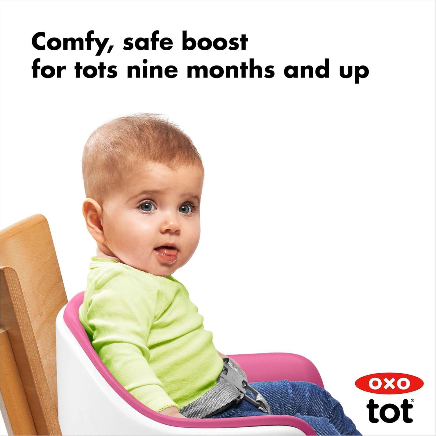 The OXO Tot Nest Booster Seat gives kids as young as nine months a secure seat at the family table. With a soft, removable cushion and high back and sides, the Nest Booster transforms any grown-up chair into a child-friendly seat. Two side-release buckles keep kids securely strapped in (and prevent them from escaping!). The back and bottom chair straps are adjustable for a secure fit on different chair styles and sizes, and the non-slip feet keep the Booster Seat stable while protecting chairs from scratches. The 3-point harness keeps even the wiggliest tot secure and adjusts as your child grows. The built-in handle allows for easy transport, and the straps store neatly in a compartment under the Booster Seat when not in use.