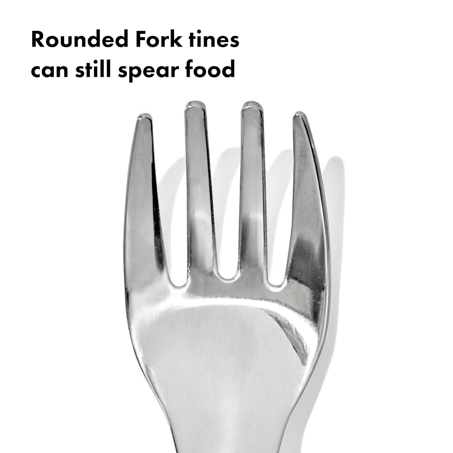 The OXO Tot On-the-Go Fork & Spoon Set was designed for meals while out and about—whether that’s a picnic in the park, at school or just in the backyard. The stainless steel Fork tines are rounded (to protect little fingers) but can still spear food, and the matching Spoon is extra-deep for optimal scooping. The curved, non-slip handles are easy for learning hands to hold and feature a flat spot to keep the utensils from rolling away. Plus, the compact travel case can be easily tucked into lunchboxes, diaper bags, purses or pockets. Dishwasher safe.