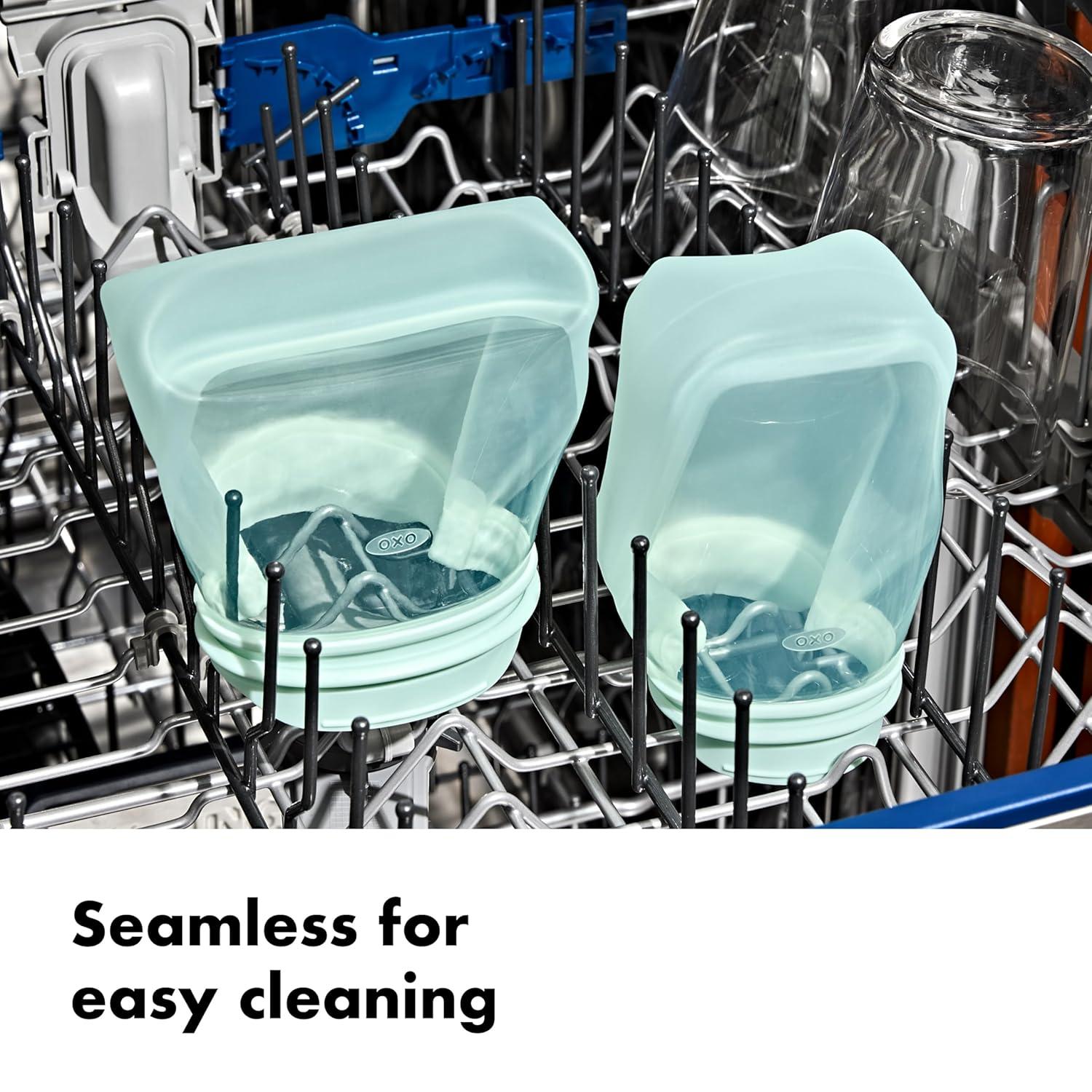 Take snacktime to the next level with a reusable alternative to finicky, single-use plastic baggies. The OXO Tot Silicone Reusable Bags keep snacks fresh with a strong seal, and are seamless for easy, thorough cleaning. They flip inside out to get fully clean in the dishwasher or by hand. The Stand-Up Cups have a flat bottom and a wide opening for filling and snacking with less fumbling, whether you’re filling the two 8 oz/235 mL Stand-Up Cups with dry cereal or sliced grapes. These Cups are also great for keeping small toys or baby accessories from getting lost at the bottom of bags. Freezer, microwave, and oven safe. BPA-free, PVC-free, and Phthalate-free food-grade silicone.