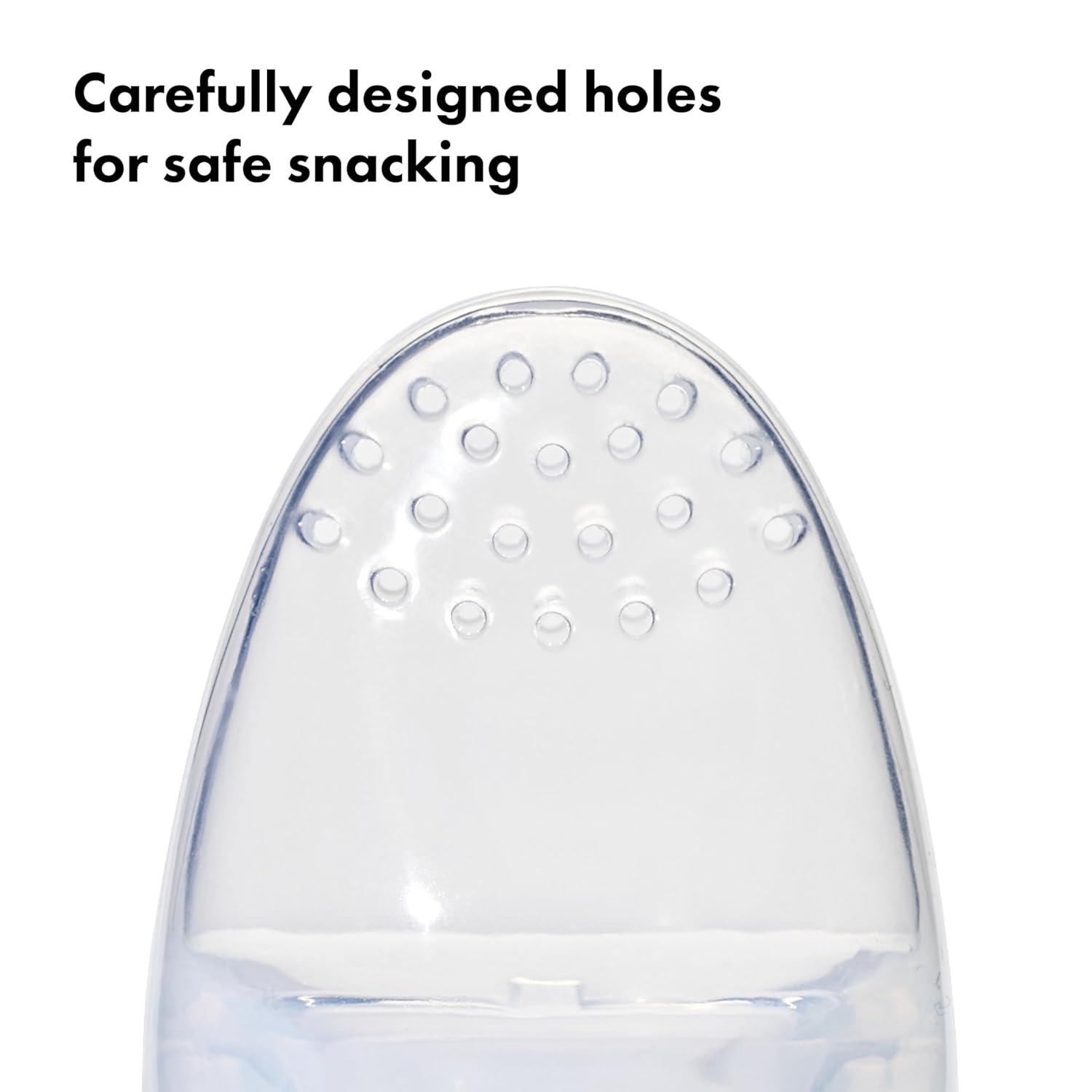 The OXO Tot Silicone Self-Feeder is a safe way for little ones learning to snack on their own. The large-capacity silicone pouch is perfect for holding pieces of strawberries, oranges, or other yummy fruits or veggies, while the pouch’s holes make it safe for baby to access the fruit in small bites. You can also use it to soothe teething tots by adding frozen fruit. The right-sized handle is non-slip and easy for little fingers to grasp. When snack time is over, the silicone is easy to clean and the childproof lock is easy for grown-ups to take apart. Top-rack dishwasher safe. Set of two.