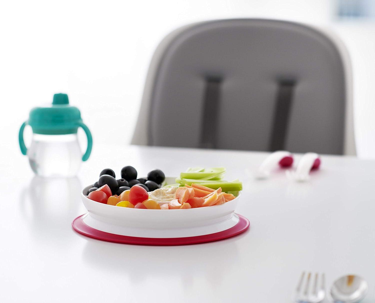 Cut down on mealtime messes with the OXO Tot Stick & Stay Suction Divided Plate. The Plate features a silicone base that sticks surfaces until mealtime is over, preventing sliding, slipping and tipping. A parent-friendly opening makes removing the Plate simple for adults, but tough for kids. Curved side walls and separate sections (plus a center spot for dips and treats) allow for simple scooping and encourage self-feeding. When your tot is finished, twist the Plate and base apart to clean in the dishwasher.